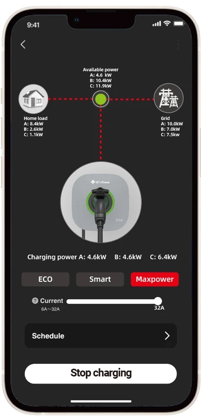 .Această stație este echipată cu funcția de balansare dinamică a sarcinii (Dynamic Load Balancing), reglând automat puterea în funcție de consumul total de energie din casă. Astfel, se optimizează consumul de energie, se previn suprasarcinile și se reduc facturile la electricitate, asigurând în același timp o eficiență ridicată a încărcării.