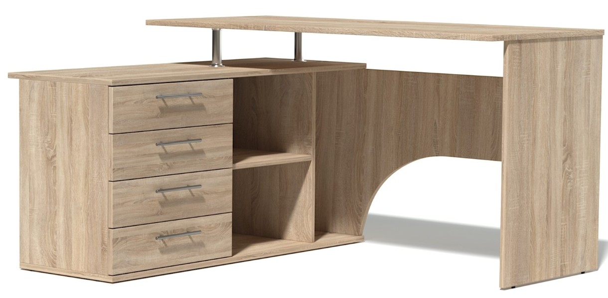 Masa pentru calculator de colț cu două suprafețe de lucru. Blatul principal are o lățime de 1400 mm, permițându-vă să plasați un calculator și materiale de lucru. Pe un blat mic — 1200 mm este convenabil să păstrați cărți, dosare, papetărie, imprimantă etc. Masa este echipată cu un dulap cu patru sertare, rafturi deschise și o nișă pentru unitatea de sistem. Acest model de masă pentru calculator vă permite să organizați o zonă de lucru funcțională, atât acasă, cât și în birou.