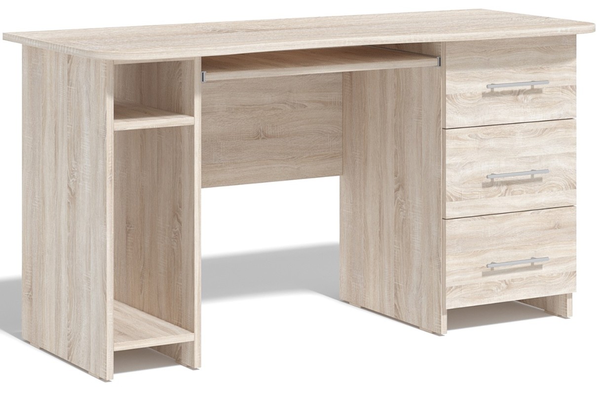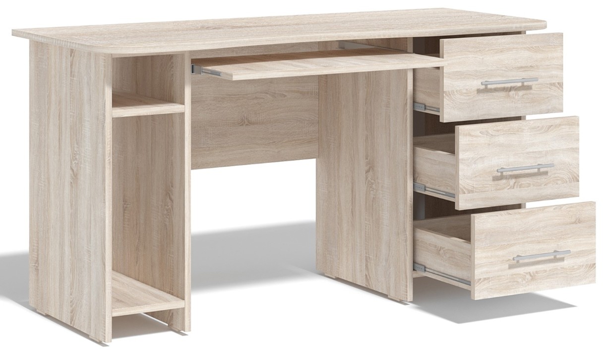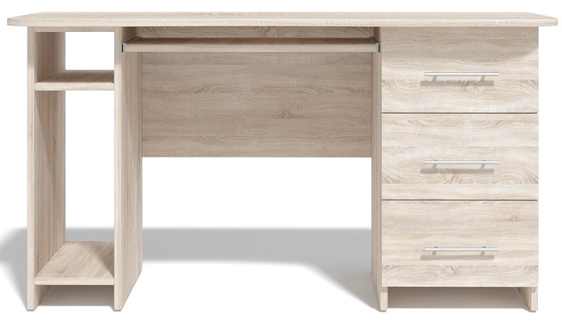 Versiunea tradițională compactă a unei mese de calculator cu trei sertare și un loc pentru o unitate de sistem PC. Fără a ocupa prea mult spațiu în cameră, o masă de calculator va crea un loc de muncă pentru un elev sau un angajat din birou. Blatul are o formă dreaptă, cu marginile rotunjite. Raft extensibil de tastatură sub blatul de lucru.