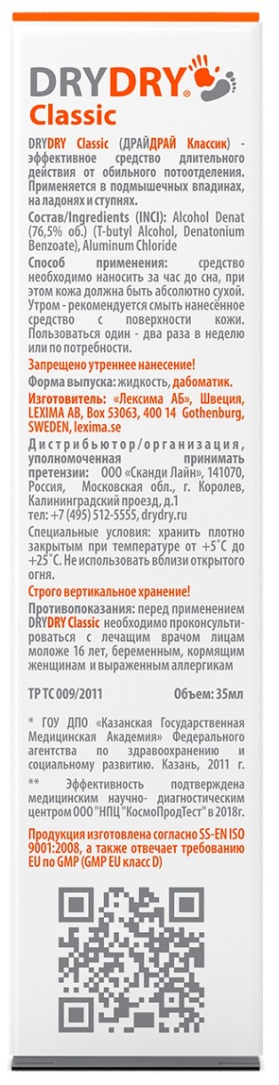 Effektivnoye sredstvo dlitel’nogo deystviya ot obil’nogo potootdeleniya DRYDRY Classic V osnove deystviya preparata lezhit «blok» por posredstvom formirovaniya alyuminiyevo-belkovogo kompleksa. Radioizotopnyy analiz pokazal, chto aktivnyye komponenty ne narushayut funktsii potovykh zhelez. V rezul’tate «bloka» proiskhodit perenapravleniye vydeleniya pota cherez pory drugikh uchastkov tela. Effektivnost’ zashchity ot pota napryamuyu svyazana s takimi pokazatelyami, kak tip alyuminiyevoy soli, yeyo kontsentratsiya v produkte i uroven’ pH, t.ye. s formuloy DRYDRY Classic. Sposob primeneniya: DRYDRY Classic rekomenduyetsya nanosit’ na absolyutno sukhuyu nepovrezhdennuyu kozhu za chas do sna. Utrom — obychnyye vodnyye protsedury. Vo izbezhaniye vozmozhnoy porchi odezhdy, rekomenduyetsya smyt’ nanesennoye vecherom sredstvo s poverkhnosti kozhi. Zapreshcheno utrenneye naneseniye! Mesta naneseniya neobkhodimo tshchatel’no vysushit’ pered primeneniyem. Ispol’zovaniye DRYDRY Classic mozhet vyzvat’ legkoye zhzheniye ili pokalyvaniye obrabotannykh uchastkov kozhi. Prichinoy vozniknoveniya razdrazheniya yavlyayetsya, kak pravilo, nedostatochno vysushennaya ili povrezhdennaya kozha. Pri vozniknovenii zhzheniya ili zuda smoyte Sredstvo vodoy i nanesite na razdrazhennyye uchastki DRYDRY Gel. Povtornoye naneseniye DRYDRY Classic vozmozhno ne ranneye, chem cherez 24 chasa. Ne ispol’zuyte DRYDRY Classic, yesli razdrazheniye ne prokhodit, i prodolzhayte nanosit’ DRYDRY Gel. · Dlitel’nost’ deystviya do 7mi dney* · Podkhodit dlya lyudey s normal’nym i povyshennym potootdeleniyem (gipergidrozom) · Primenyayetsya v podmyshechnykh vpadinakh, na ladonyakh ruk i stupnyakh nog