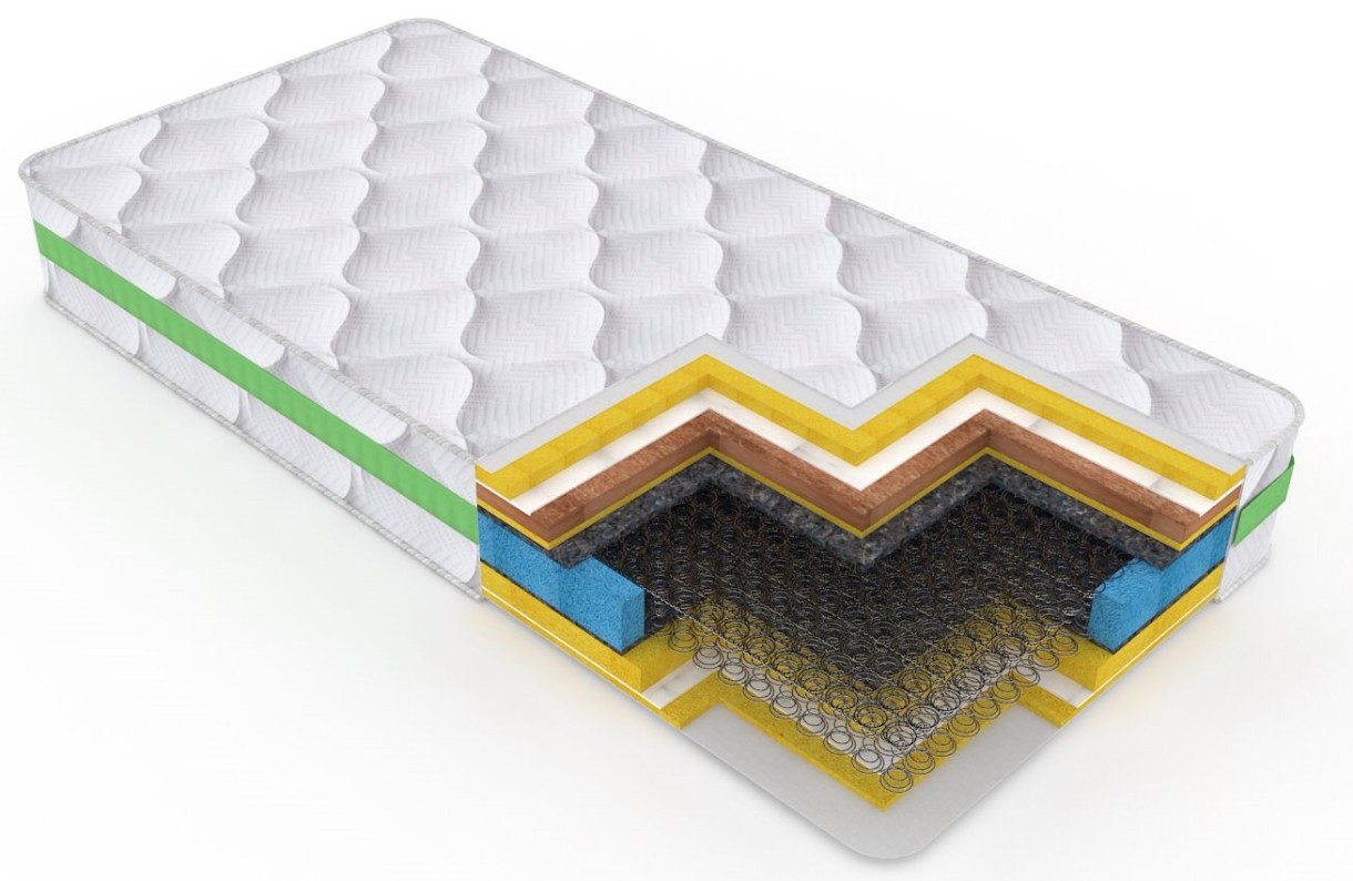 Salteaua cu fibre de cocos creează un mediu sănătos și plăcut prin folosirea materialelor cu specific BIO. Acestea asigură un suport précis pentru întregul corp, menținând coloana vertebrală într-o poziție corectă în orice moment al somnului. Salteaua este confecţionată dintr-o plasă de arcuri bitronice, de tip Hercule, cu diametru de 72 mm, 4 inele din sârmă de oţel din carbon, cu grosimea de 2,2 mm, tratate termic la curenţi de înaltă frecvenţă, ceea ce conferă o rezistenţă îndelungată a elasticităţii sârmei. Fiecare rînd de arcuri este legat de următorul printr-o sârma elicoidală, de o grosimea de 1,4 mm, ceea ce conferă rezistenţă la mişcări a saltelei. Rigidizarea perimetrală a saltelei, cu spumă poliuretanică de înaltă densitate SISTEM BOX, nu permite acesteia deformarea sau lăsarea în timp. Peste plasa de arcuri se aşează (pe ambele feţe) 1 strat de plasă thermofelt cu densitatea de 1200 g/m2. Apoi urmează un strat de spumă poliuretanică cu densitatea de 25 kg/ m3, cu o grosime de 1,5cm si 2,5cm, lipită cu adeziv special, ecologic, conform standartelor europene. Peste acest strat este aşezată o placă din fibre de cocos cu densitatea de 130 kg/ m3 şi grosimea de 10 mm. Fibrele de cocos sortate sunt presate și acoperite de lapte de latex fierbinte. Astfel rezultă un material foarte elastic și dur, și în același timp foarte rezistent.Materialul exterior este compus din 4 straturi, matlasat complet din Bumbac 80% si Polyester 20%, împreuna cu un strat de vatelină de 150g/ m2, si un strat de spuma poliuretanica cu densitate de 18kg/ m3, cu grosime de 10 mm si TNT 15g/ m2.