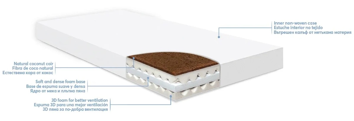 Umplutură realizată din spumă moale și densă cu nucă de cocos pentru un sprijin mai bun al coloanei vertebrale și 2 straturi de spumă 3D pentru o mai bună ventilație și prevenirea reținerii umidității.
