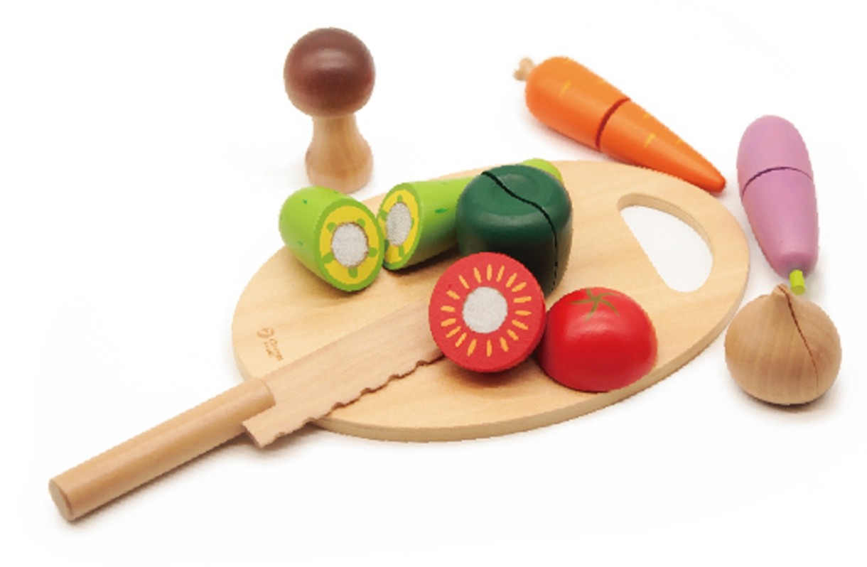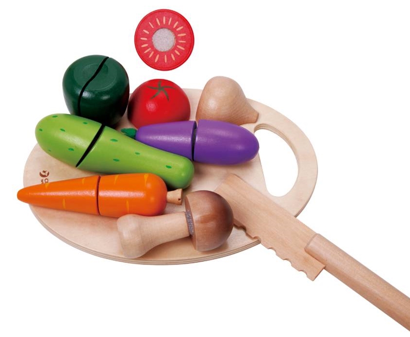 Setul include: o placă cu suspensie, un cuțit, legume: ceapă, dovlecel, roșii, ciuperci, morcovi, vinete, avocado. Constă din 2 jumătăți cu Velcro.