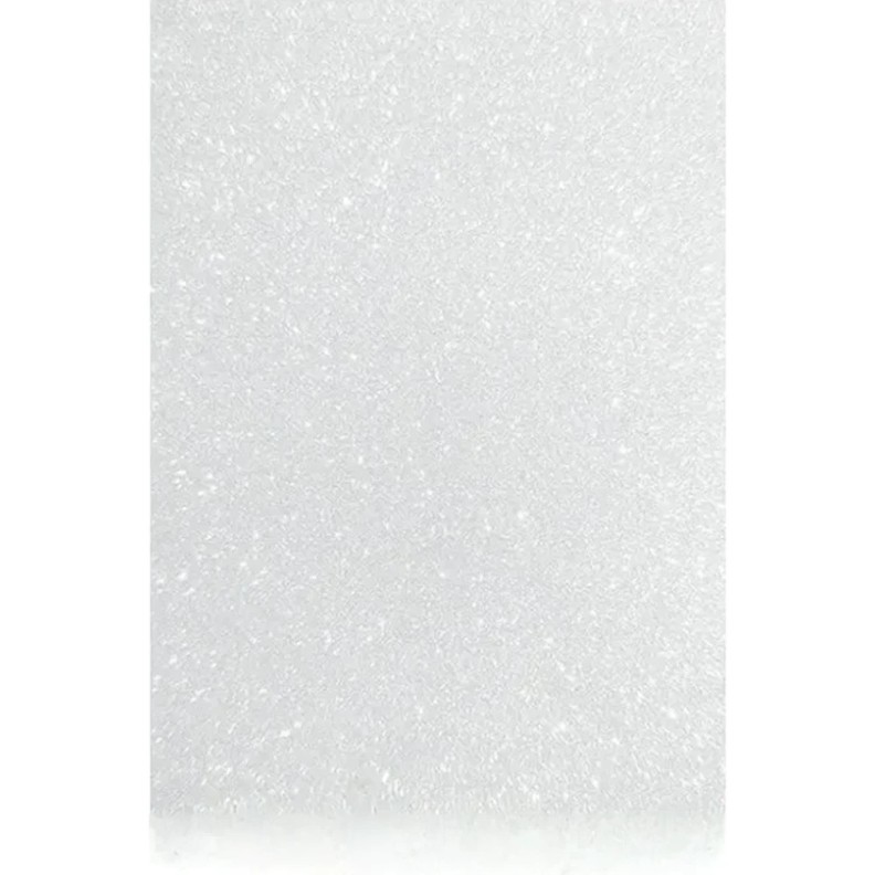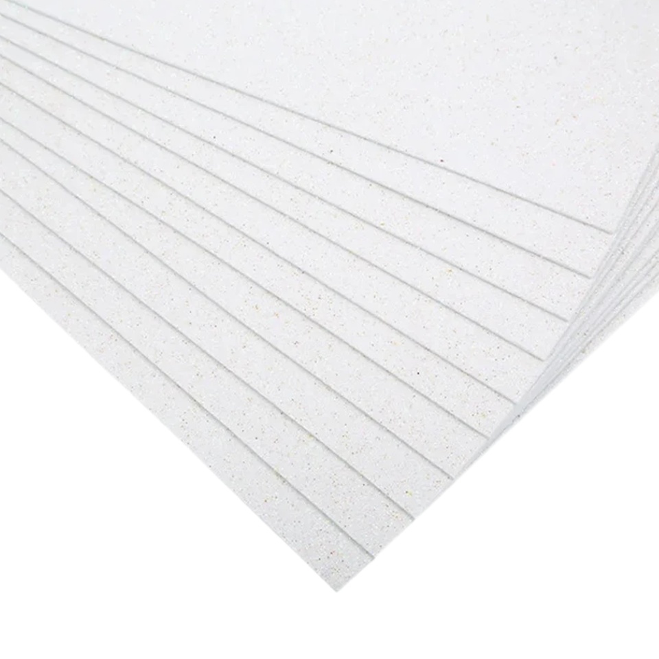 Foamiranul cu glitter este acoperit pe partea frontală cu sclipici, ceea ce permite diversificarea produselor din foamiran și le conferă strălucire. Foamiranul cu glitter se întinde bine (aproximativ 10%), se taie ușor cu foarfeca (simplă sau decorativă). Produsele din foamiran se lipesc cu pistol de lipit sau cu adeziv cu fixare puternică.