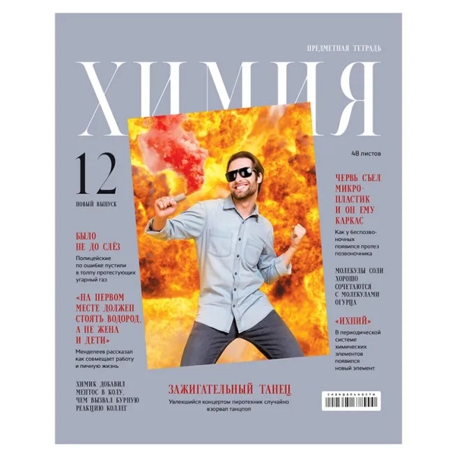 Un caiet pentru chimie cu informații de referință pe pagina de gardă și două foi suplimentare. Include și o pagină de titlu. Caietul are dimensiunea A5 și este fixat cu o capsă. Blocul interior este format din 48 de coli de hârtie offset de 65 g/m², cu alb 100%. Coperta este realizată din carton cretat cu laminare lucioasă. Atât coperta, cât și blocul interior au colțuri rotunjite.