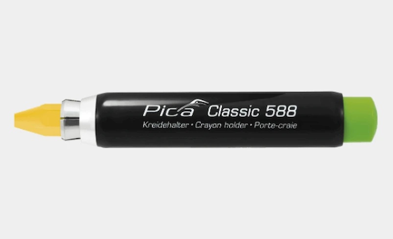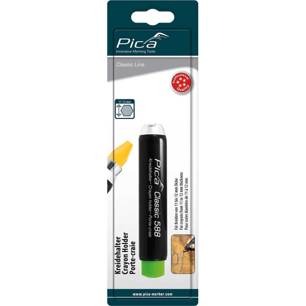 Suport de cretă de înaltă calitate, cu mecanism de apăsare și formă ergonomică triunghiulară rotunjită. Carcasa din plastic este realizată din ABS rezistent la șocuri, butonul de apăsare este de culoare verde clasică Pica. Menghină metalică. Potrivit pentru crete cu grosimea de 11–12 mm.