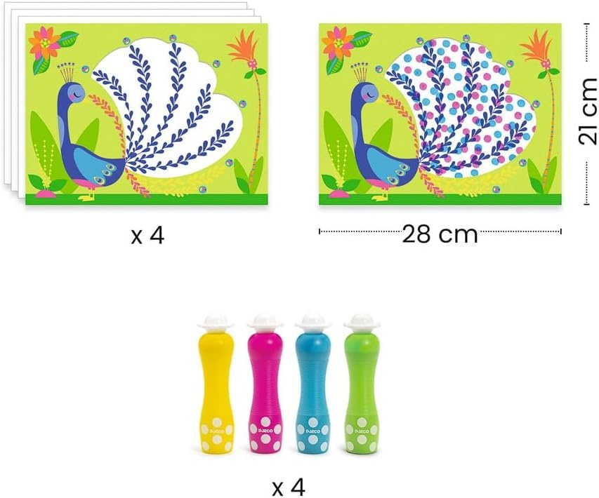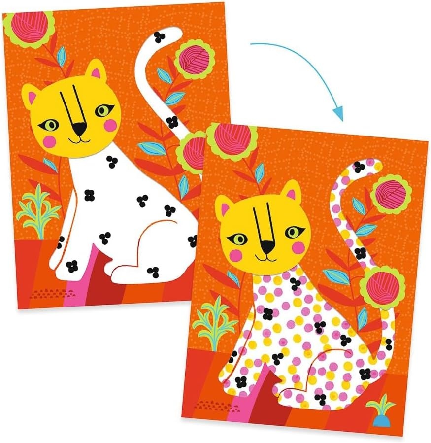 Punct cu punct, copiii adaugă culoare celor 4 imagini ilustrate. Un crocodil, un păun, o pisică și un elefant pot fi colorați cu puncte galbene, roz, albastre sau verzi. Aceste creioane sunt perfecte pentru a crea grafică colorată. Copiii pot desena puncte liber, chiar dacă depășesc liniile. Închid punga, iar toate micile greșeli dispar: un rezultat reușit de fiecare dată!