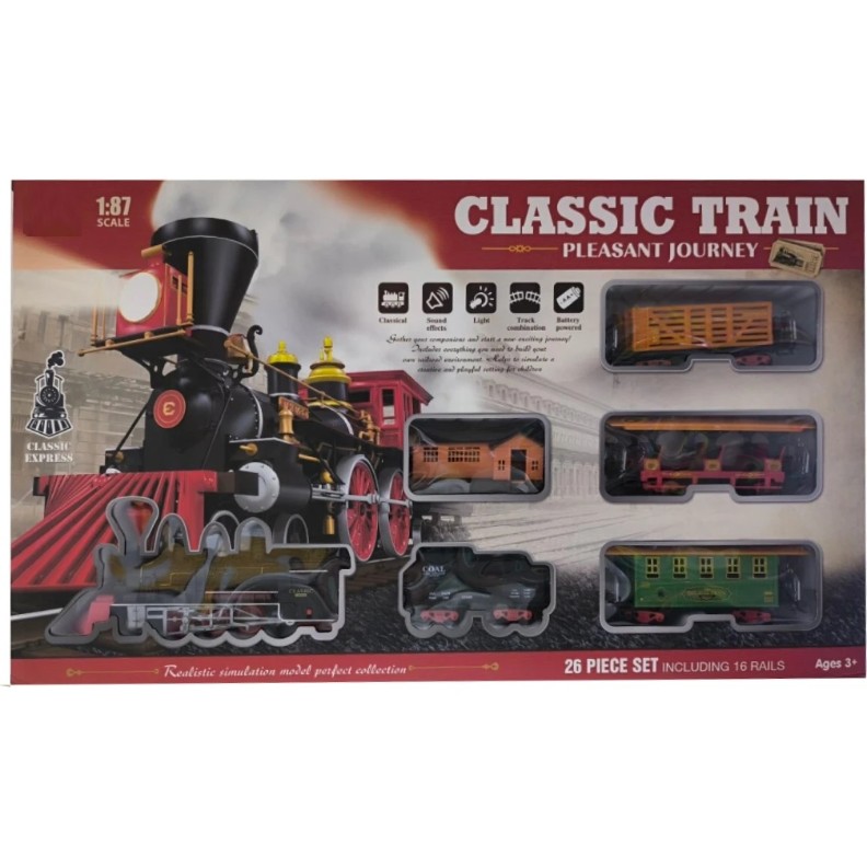 Construiește propria ta mică cale ferată cu acest set colorat! Copilul poate asambla mai multe configurații de traseu, pe care va circula trenul vintage detaliat. Fiecare vagon este diferit și are propria funcție: două vagoane pentru pasageri și două pentru transportul mărfurilor.