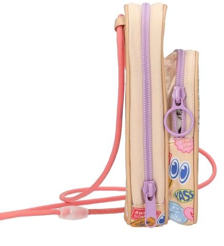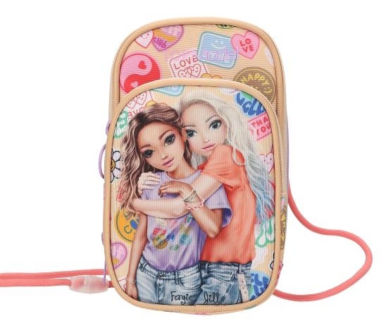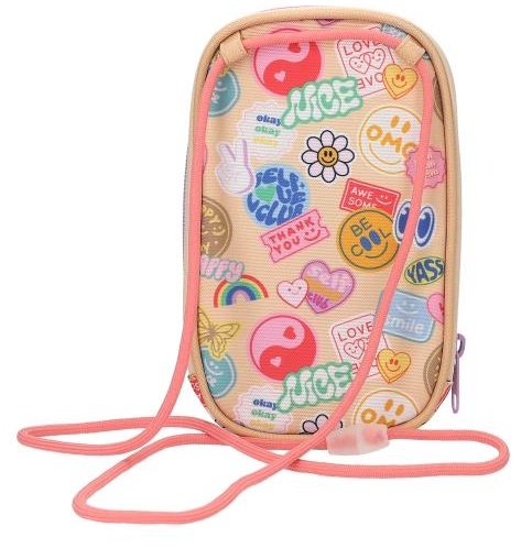 Batch Boom! Geanta pentru smartphone TOPModel în culorile bej, coral și liliac, are un motiv elegant cu model dublu pe buzunarul frontal și imprimeuri batch colorate și cool pe toată suprafața. Cu două compartimente cu fermoar și două compartimente suplimentare în interior. Cureaua de umăr are un sistem de închidere de siguranță care se deschide atunci când este trasă brusc.