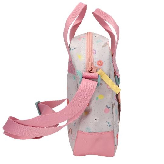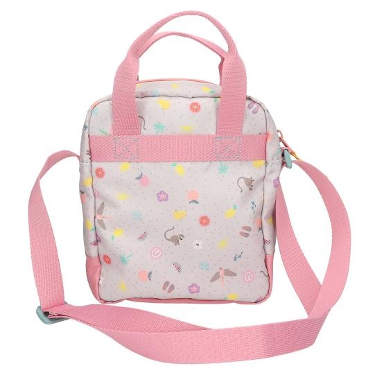 Animal-fructat-drăguț: Geanta de umăr TOPModel Juicy are un motiv dublu mare cu o maimuță pe față și un imprimeu vesel cu puncte mici, flori, fructe, maimuțe, păsări, palmieri și accesorii de vară de jur împrejur. Mânerele, cureaua reglabilă și fermoarul sunt roz. Închiderea cu fermoar are un mâner textil galben. Compartimentul interior are un buzunar interior suplimentar. Cool: există un inel pe mâner, de exemplu pentru atașarea pandantivelor.