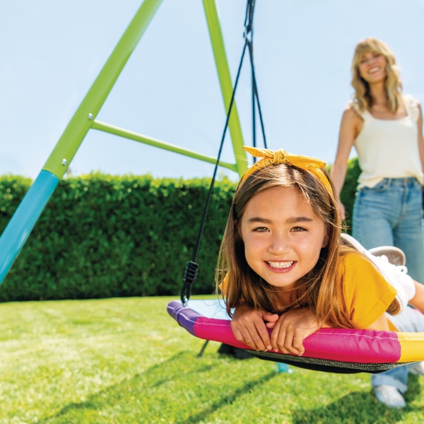 Leagănul de tip cuib dispune de un cadru circular căptușit și o plasă de ședere rezistentă, oferind confort și siguranță copilului dumneavoastră. Datorită dimensiunilor sale generoase, poate fi utilizat simultan de până la doi copii.