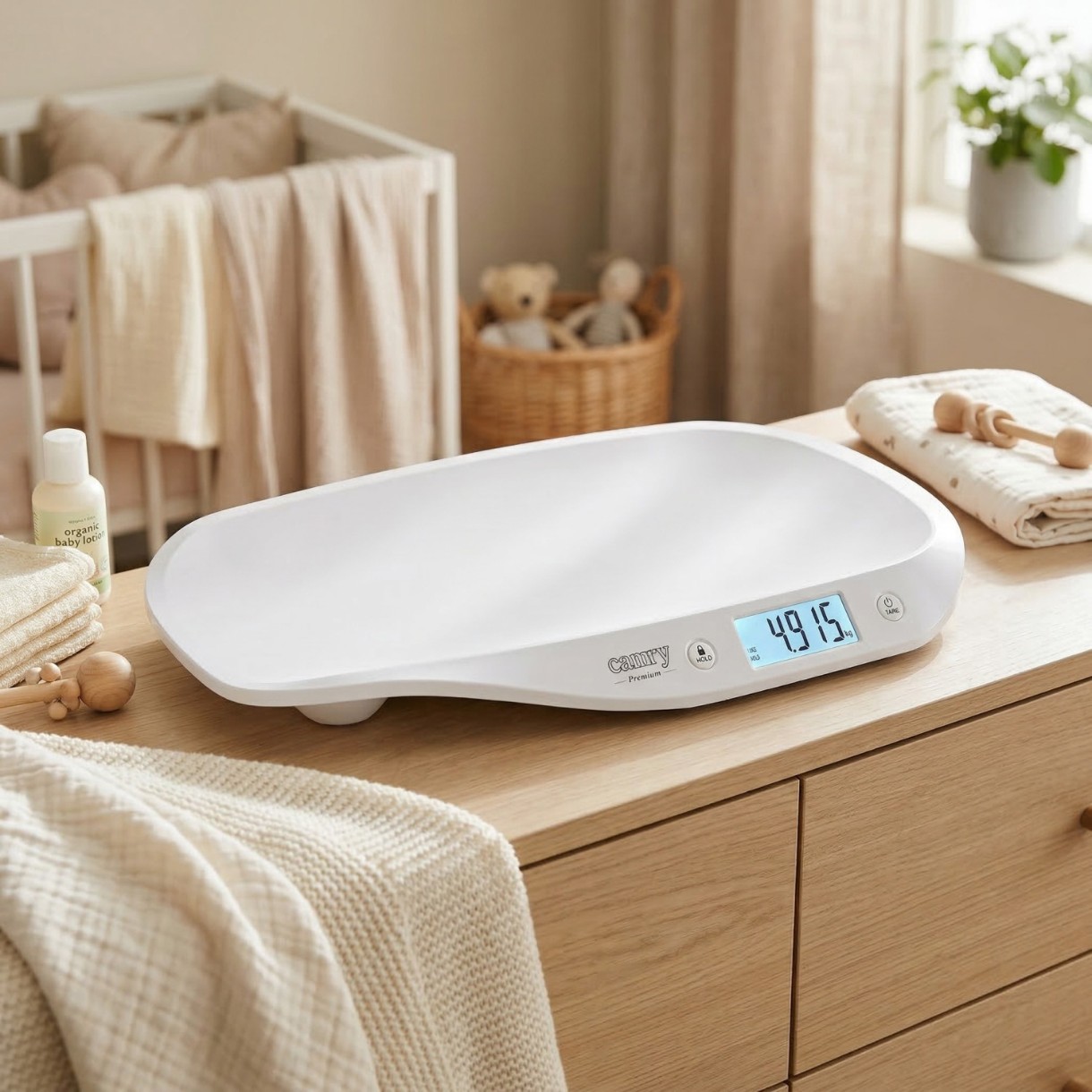 Cântarul electronic pentru bebeluși Camry CR-8185 este un dispozitiv modern, conceput pentru măsurarea precisă a greutății copiilor încă din primele zile de viață. Platforma sa mare și stabilă asigură confort și siguranță în timpul cântăririi. Aparatul poate suporta o greutate de până la 20 kg, ceea ce permite utilizarea lui pe o perioadă îndelungată pe măsură ce copilul crește. Precizia de măsurare este de 5 grame, oferind rezultate foarte exacte și de încredere. Funcția HOLD permite stabilizarea rezultatului chiar și atunci când bebelușul se mișcă. Funcția de tară ajută la scăderea greutății scutecului sau a păturii pentru a afișa doar greutatea copilului. Ecranul LCD cu iluminare facilitează citirea valorilor în orice condiții de lumină. Cântarul are funcție de oprire automată pentru economisirea bateriei. Designul compact și ușor îl face simplu de depozitat și transportat. Camry CR-8185 este o alegere practică pentru monitorizarea sănătății și dezvoltării copilului acasă.