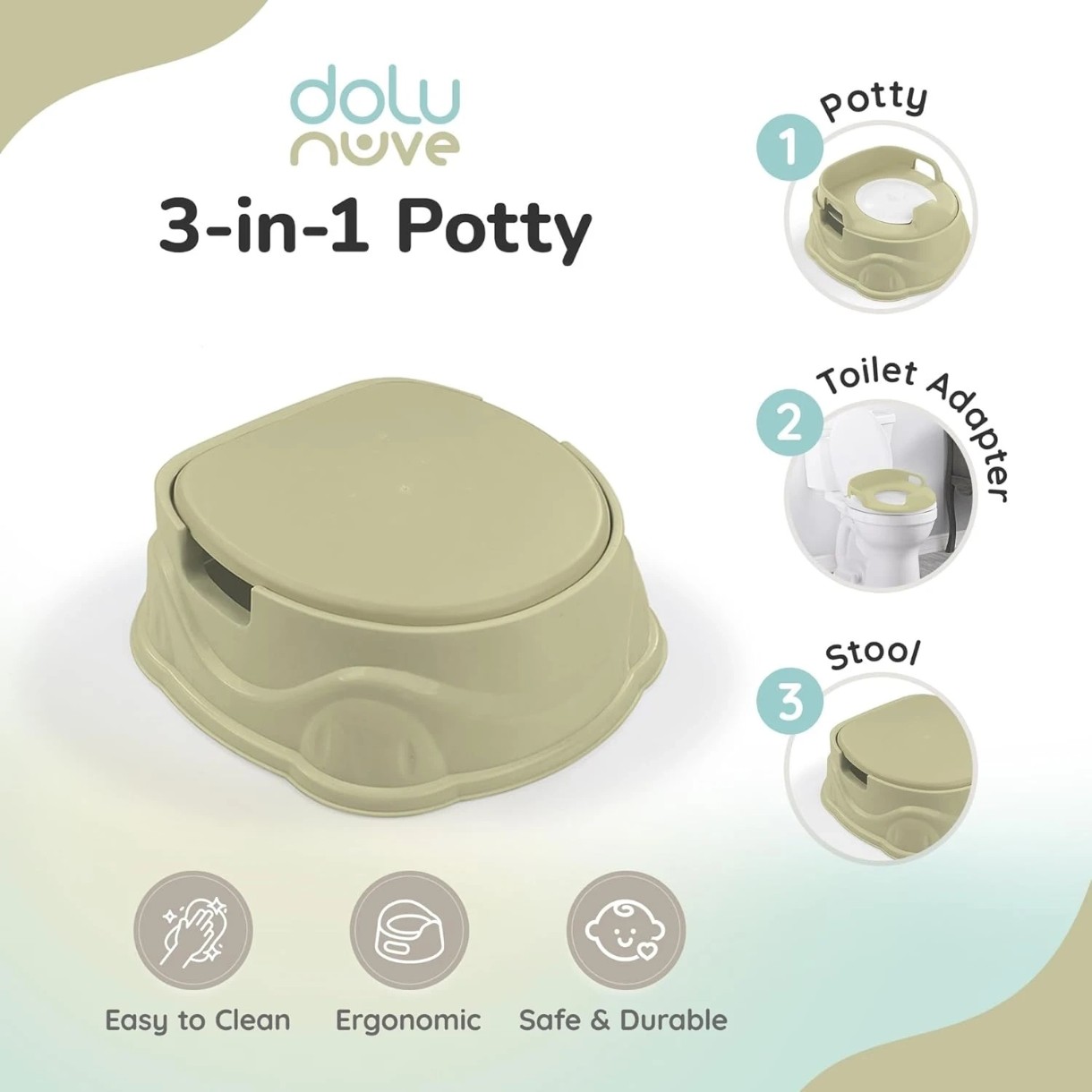 Această oliță 3-în-1 de la Dolu este ideală pentru învățarea folosirii toaletei datorită celor trei funcții ale sale. Primești nu doar o oliță, ci și un reductor pentru WC și o treaptă!