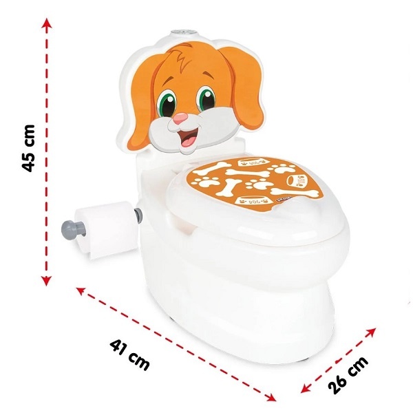 Olita este realizata in forma de toaleta si are o forma anatomica care va oferi bebelusului confort si comoditate, iar parintelui o curatare rapida. Olita este echipata cu un spate detasabil, care are o forma ondulata si un autocolant luminos cu poza unui catelus. Fluxul este simulat de un buton încorporat cu efecte; reproduce zgomotul realist al apei și se luminează în diferite culori atunci când este activat.