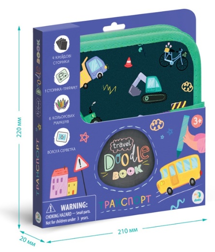 In set4 pagini tip tablă (pentru cretă), 1 pagină cu șablon, 1 pagină transparentă, 1 șervețel umed, 6 markere colorate, Mapă de depozitare