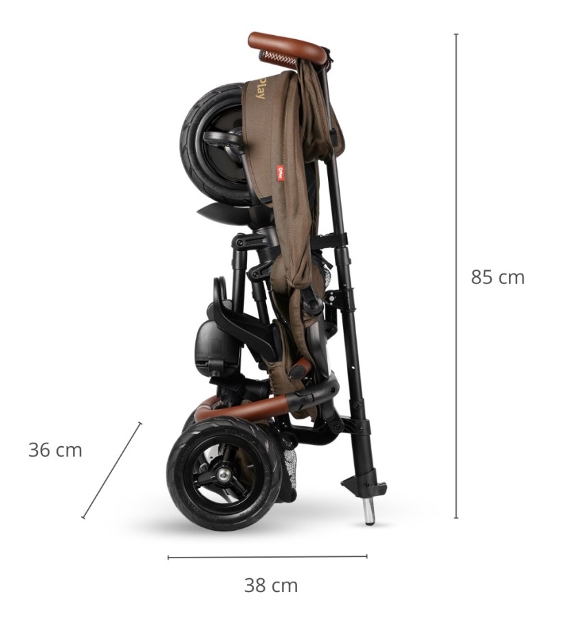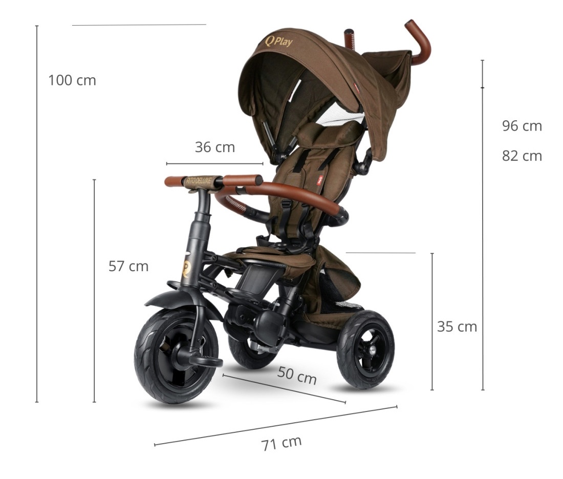Spatarul tricicletei are doua pozitii de ajustare pe spate, este bine matlasat si echipat cu centura de siguranta in 5 puncte, ceea ce face tricicleta nu doar comoda ci si sigura. In plus, pentru siguranta, Qplay Rito Deluxe vine dotata cu frana dubla pe spate siguranta de pliere.