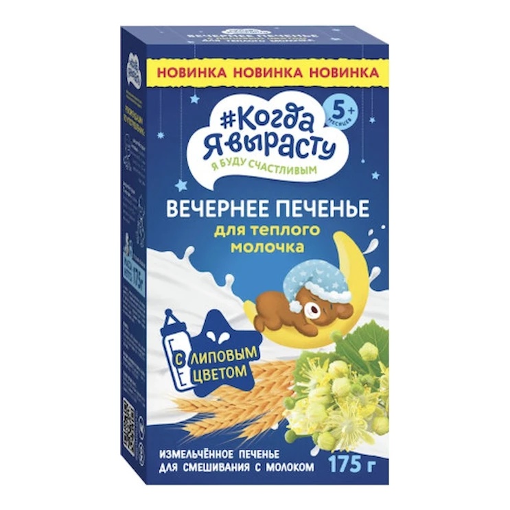 Biscuiți solubili „De seară” cu flori de tei sunt destinați copiilor peste 5 luni. Biscuiții măcinați se dizolvă rapid și uniform în lapte, au efect calmant și dezvoltă simțul gustului. Îmbogățiți cu vitamine (B1, B2, B6, PP) și minerale (Ca, Fe), fără coloranți, conservanți și OMG.