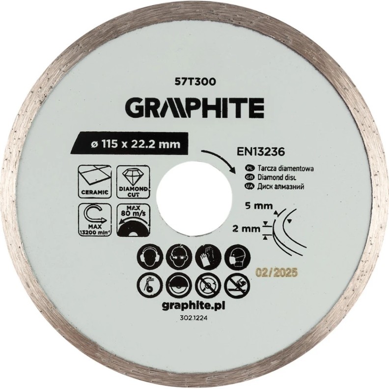 Înălțimea segmentelor de 5 mm contribuie la realizarea unor tăieturi mai adânci și mai curate, ceea ce este deosebit de important atunci când se lucrează cu suprafețe ceramice subțiri și fragile. Cu un număr maxim de rotații de 13200, Graphite 57T300 permite finalizarea rapidă și de calitate a sarcinilor, fără a compromite standardele. Utilizarea acestui disc simplifică semnificativ procesul, permițând meșterilor să se concentreze pe alte aspecte ale muncii. Va deveni un ajutor de încredere atât pentru profesioniști, cât și pentru amatori, care aspiră la rezultate perfecte.