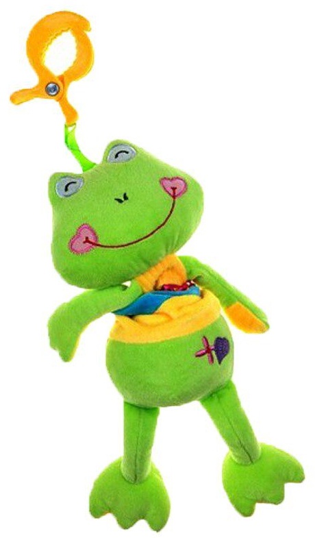Jucărie cu sunătoare poate fi atasata usor de carucior. Tragând agraful de rufe, broasca se mișcă și, cântând melodios, revine în poziția inițială.