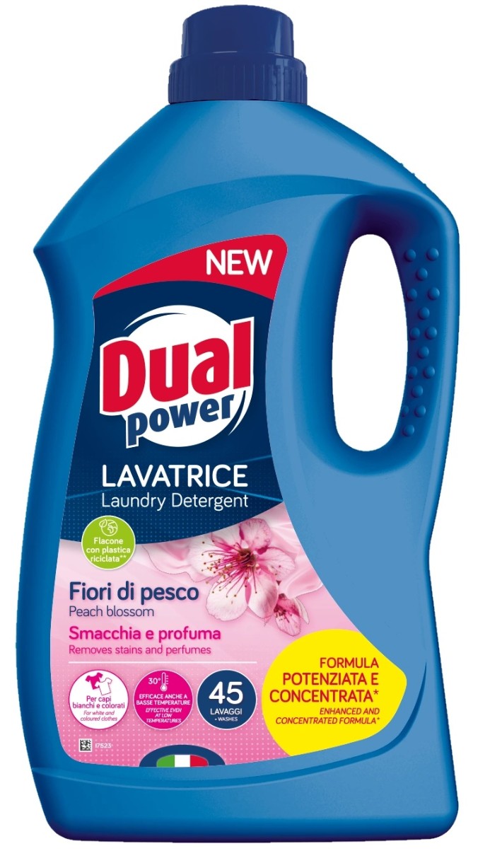 Detergent lichid Dual Power Peach Blossom pentru haine colorate oferă o curățare profundă și păstrează intensitatea culorilor. Formula sa concentrată cu enzime active pătrunde adânc în fibre, îndepărtează eficient murdăria și neutralizează mirosurile neplăcute. Hainele ies curate, cu un parfum proaspăt și delicat de floare de piersic, gata de purtat. Este potrivit pentru spălare automată și asigură până la 45 de spălări, fiind ideal pentru familii sau pentru cei care spală des.