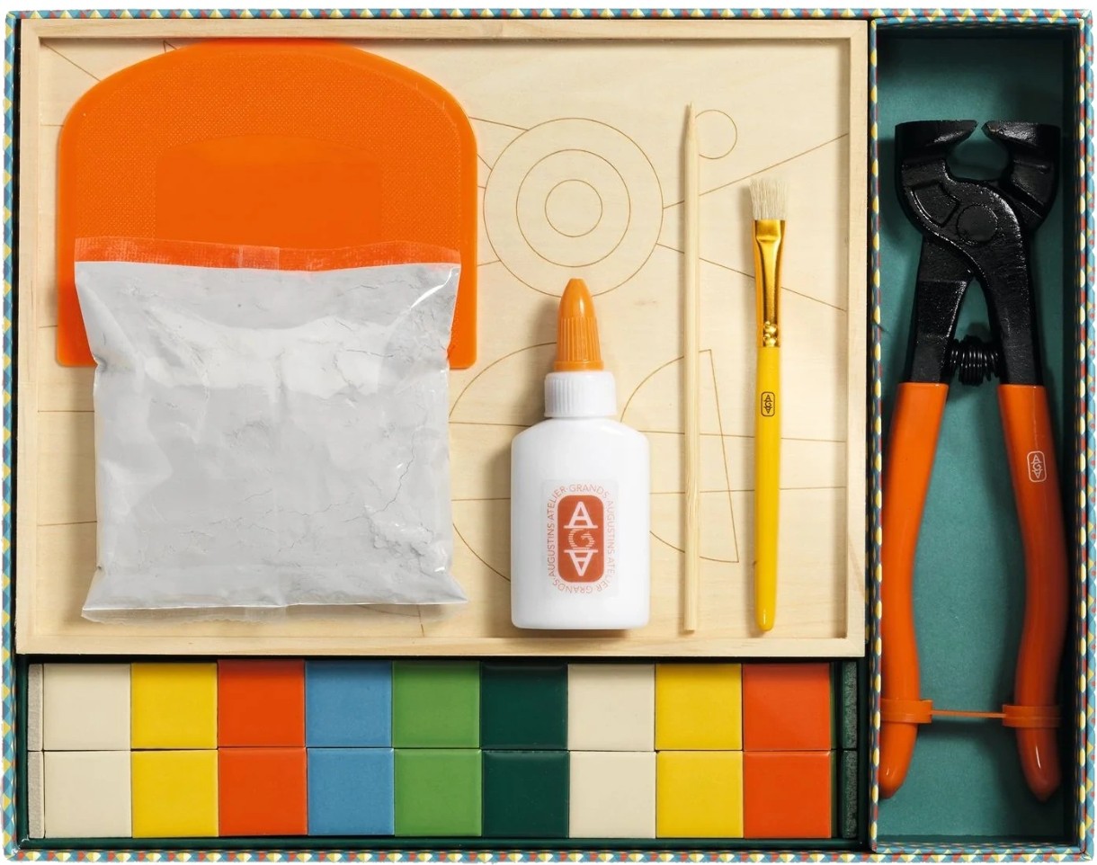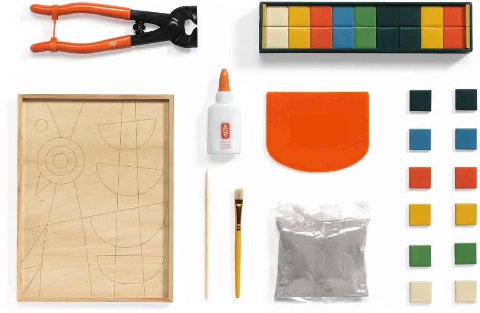 Folosind un clește de mozaic, vei învăța cum să desprinzi și să asamblezi plăci ceramice mici pentru ca designul tău să prindă contur pe un panou de lemn imprimat. Kitul conține tot ce ai nevoie: lipici, ciment, unelte profesionale, iar un tutorial video te ghidează pas cu pas pentru a învăța tehnica corectă.