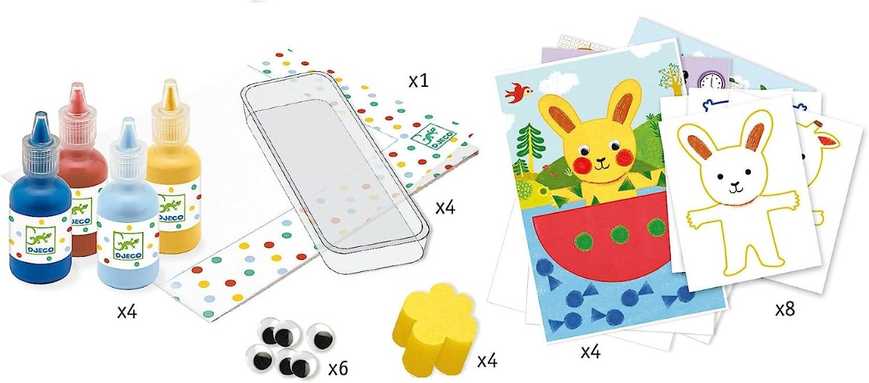 In set4 cartonase mari ilustrate (25,5 x 38 cm), 8 pagini pentru colorat cu forme libere, 4 sticle (30 ml) de vopsea opaca acuarela, 2 role, 1 pensula, 4 bureti, 6 ochi, 1 fata de masa de protectie, tava, 1 brosura cu instrucțiuni pas cu pas