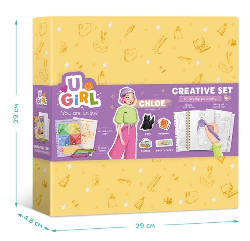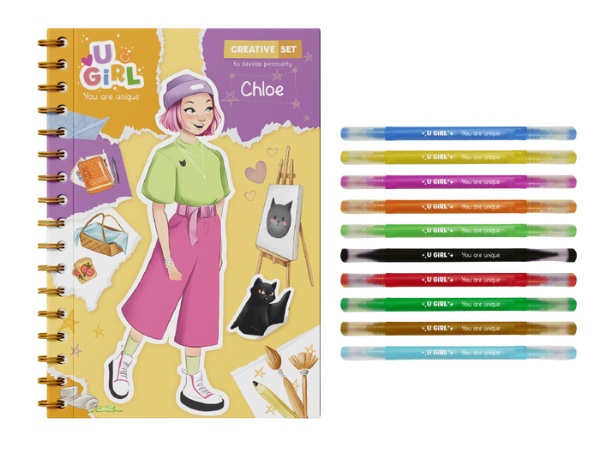 Pătrunde în lumea creativității cu setul unic UGIRL. Tot ce ai nevoie pentru inspirație într-o singură cutie: un caiet cu sarcini creative, 10 markere colorate, autocolante, planșe de colorat, siluete pentru crearea ținutelor, pagini cu desen pas cu pas și proiecte interesante de bricolaj.