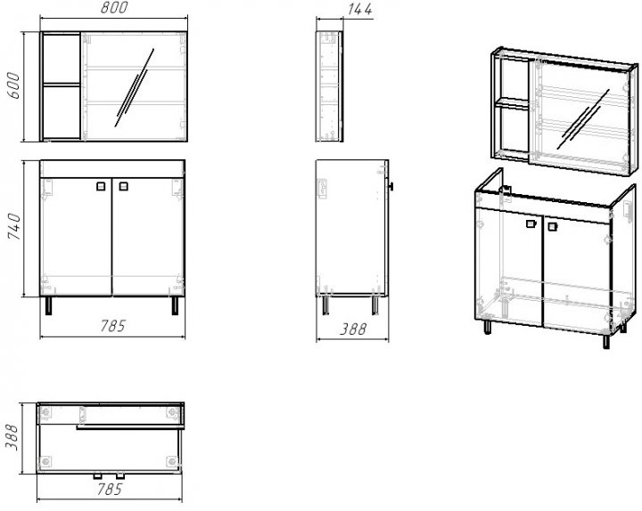 Dimensiuni dulap cu oglinda (LxÎxA)800x600x144 mm