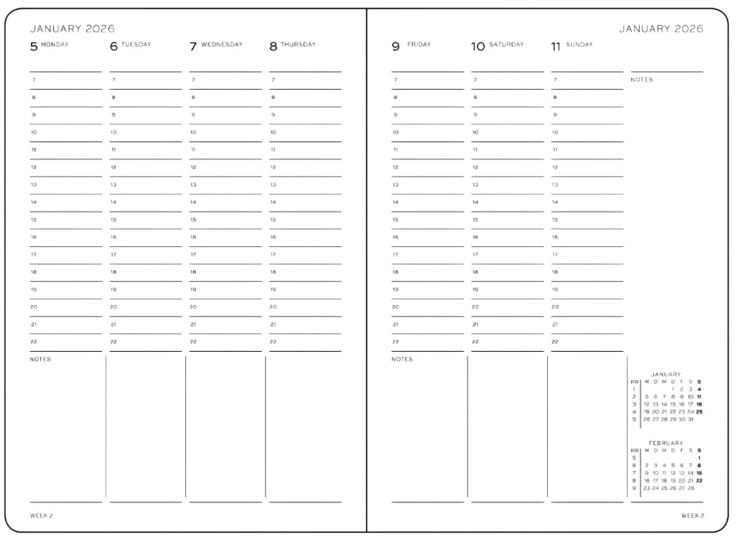 Planificatorul săptămânal Leuchtturm1917 în format B6+ este un ghid simplu, dar funcțional, pentru tot anul. Zilele săptămânii sunt aranjate în coloane pe pagină (cu o coloană separată pentru sâmbătă și duminică), cu intervale orare pe fiecare linie, de la 7:00 la 22:00.