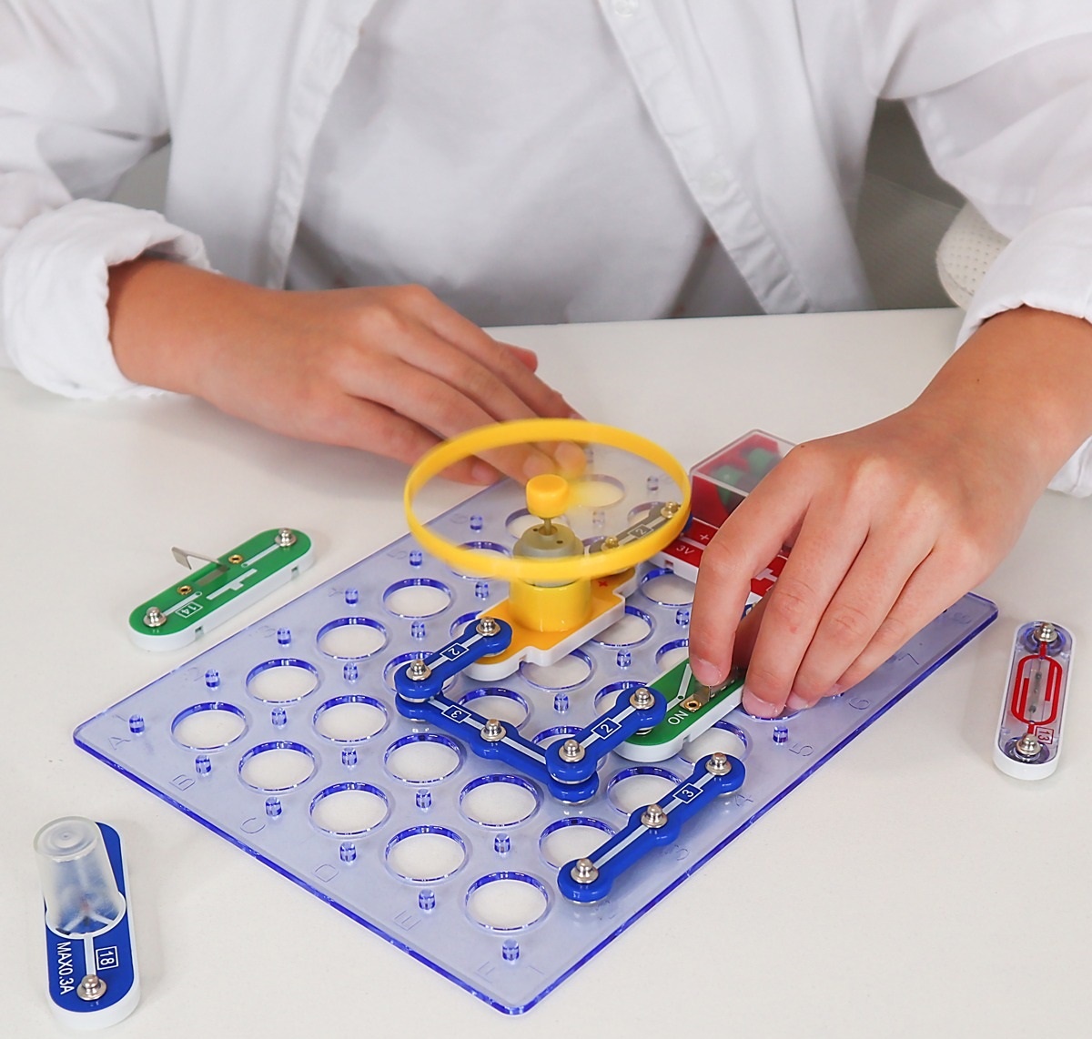 Constructorul oferă 15 circuite diferite, pentru asamblarea cărora copilul va putea folosi conductori, baterii, întrerupătoare, lămpi și motoare electrice, asamblându-le și descoperind multe lucruri noi și interesante, fără a utiliza metoda periculoasă a lipirii.