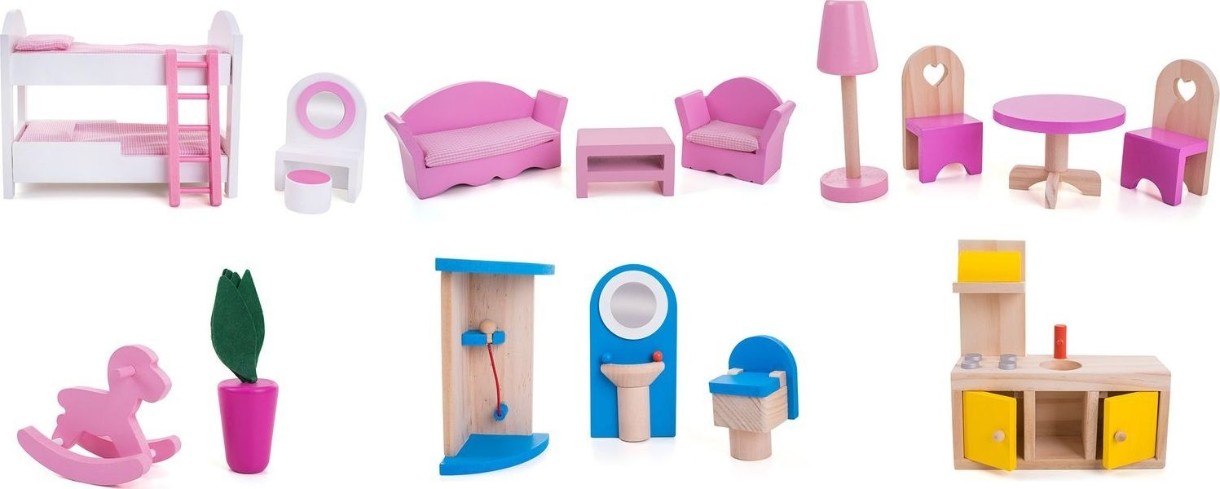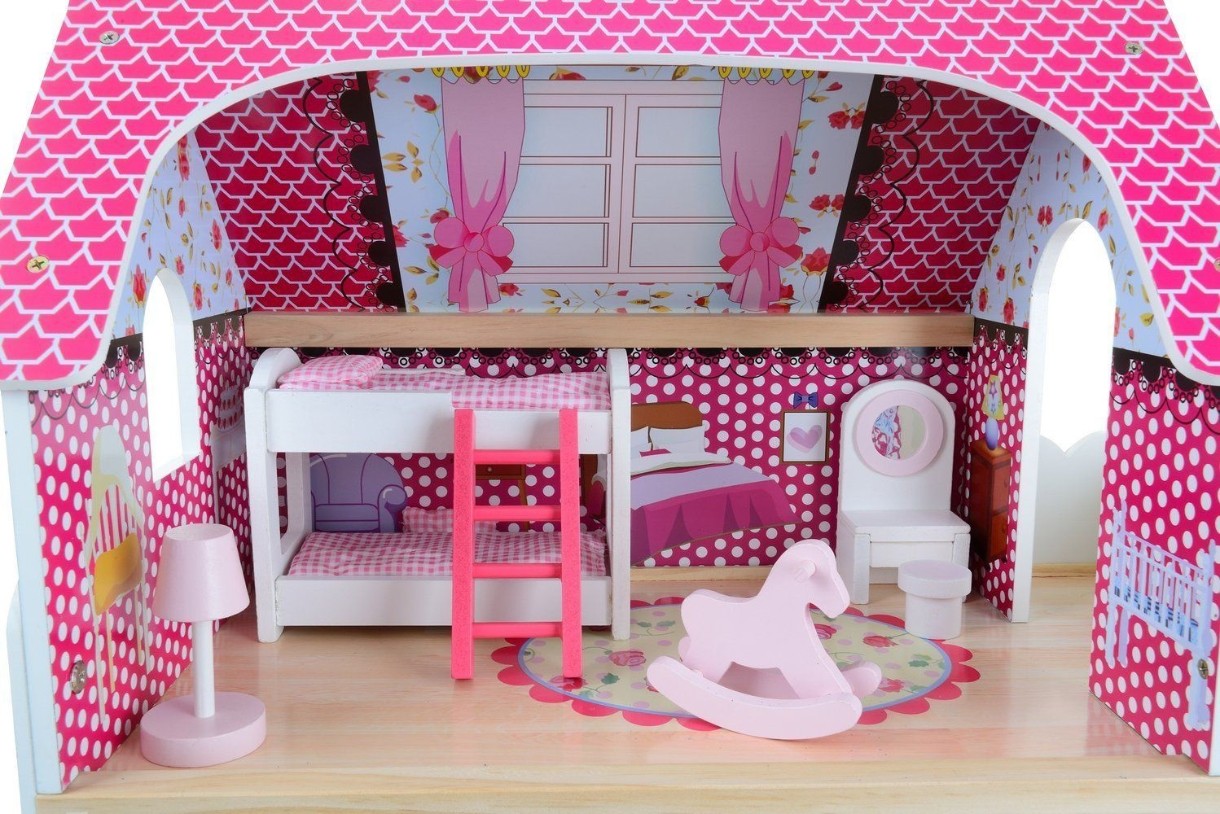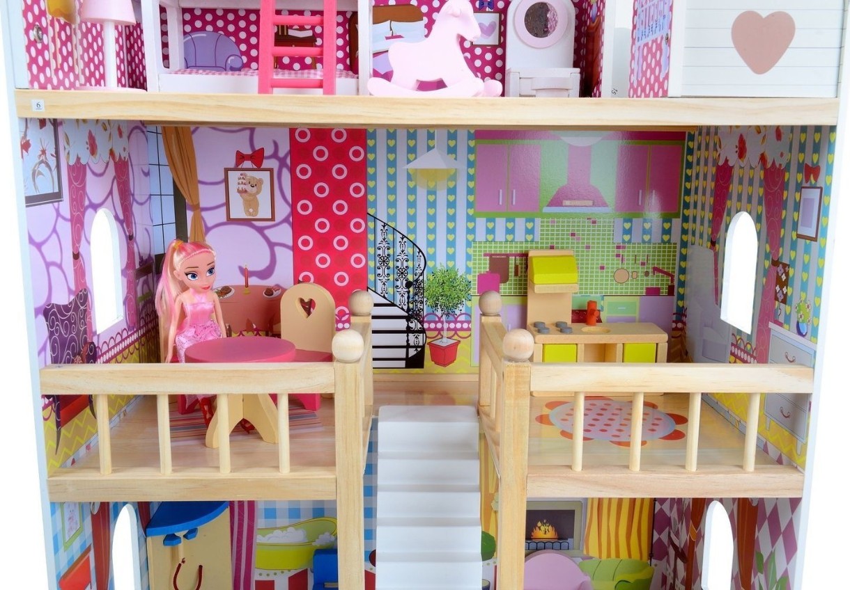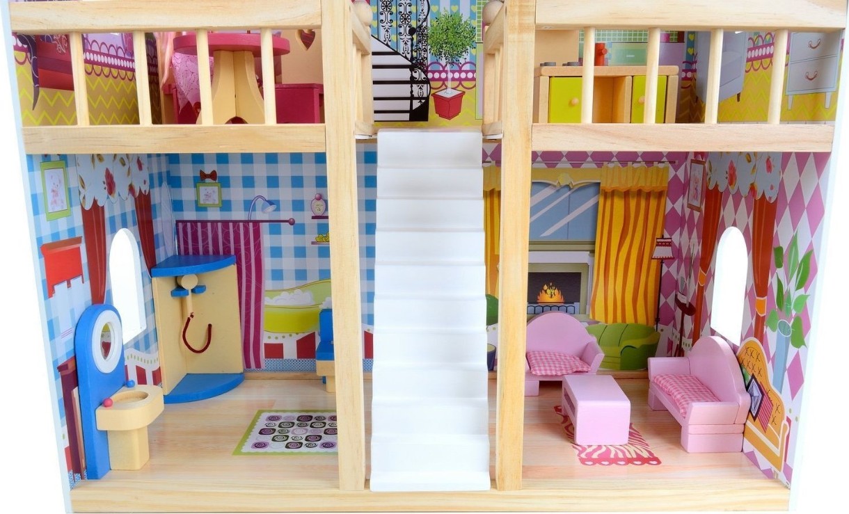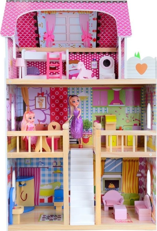 Construcție robustă, din lemn. Trei etaje cu terasa. Cinci camere independente: bucatarie, sufragerie, living, dormitor, baie. Fiecare cameră este complet mobilată. Setul include 17 piese diferite de mobilier și accesorii. Design atent al acoperișului pentru o joacă ușoară. Mobilierul, balustradele scărilor și accesoriile sunt realizate din lemn masiv. Casa fabulos de colorată va trezi imaginația copilului. Fiecare element al casei este realizat cu atentie la detalii. Datorită stabilității, copilul tău este complet în siguranță în timp ce se joacă.