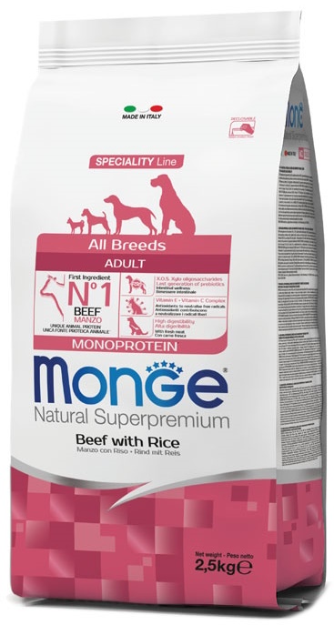 Hrană uscată pentru câini Monge Superpremium All Breeds Adult Monoprotein Beef/Rice 2.5kg