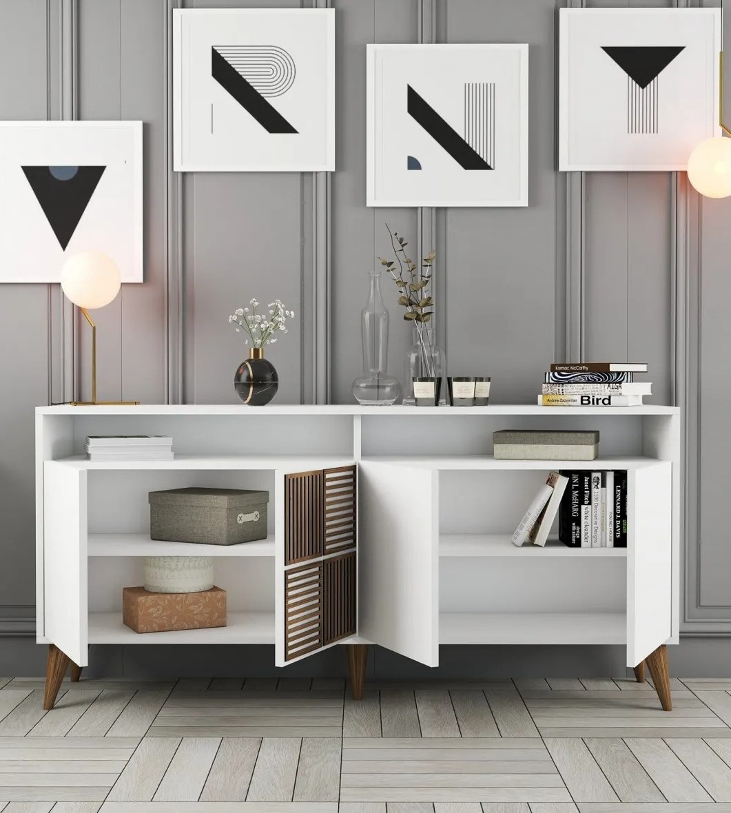 Îmbrățișați noutatea consolei noastre moderne, concepută pentru a vă înălța spațiul de locuit cu farmecul său contemporan. Liniile sale curate și designul minimalist creează un farmec vizual captivant, care cu siguranță vă va impresiona oaspeții.
