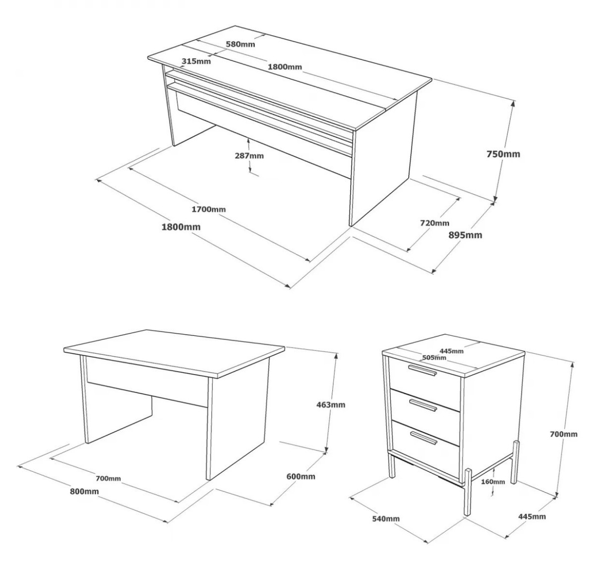 Biroul de studiu, cu dimensiunile de 180 cm lățime, 75 cm înălțime și 89,5 cm adâncime, oferă suficient spațiu pentru toate obiectele esențiale. Măsuța cuib, cu dimensiuni de 80 cm lățime, 46,3 cm înălțime și 60 cm adâncime, oferă o suprafață suplimentară pentru confort. Sertarul, cu 54 cm lățime, 70 cm înălțime și 44,5 cm adâncime, asigură un spațiu de depozitare amplu pentru a menține biroul organizat și fără dezordine.