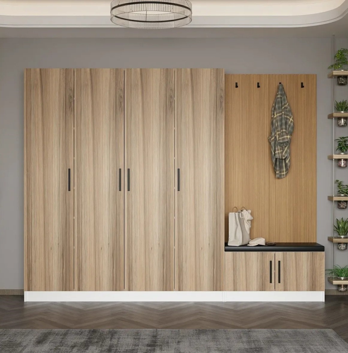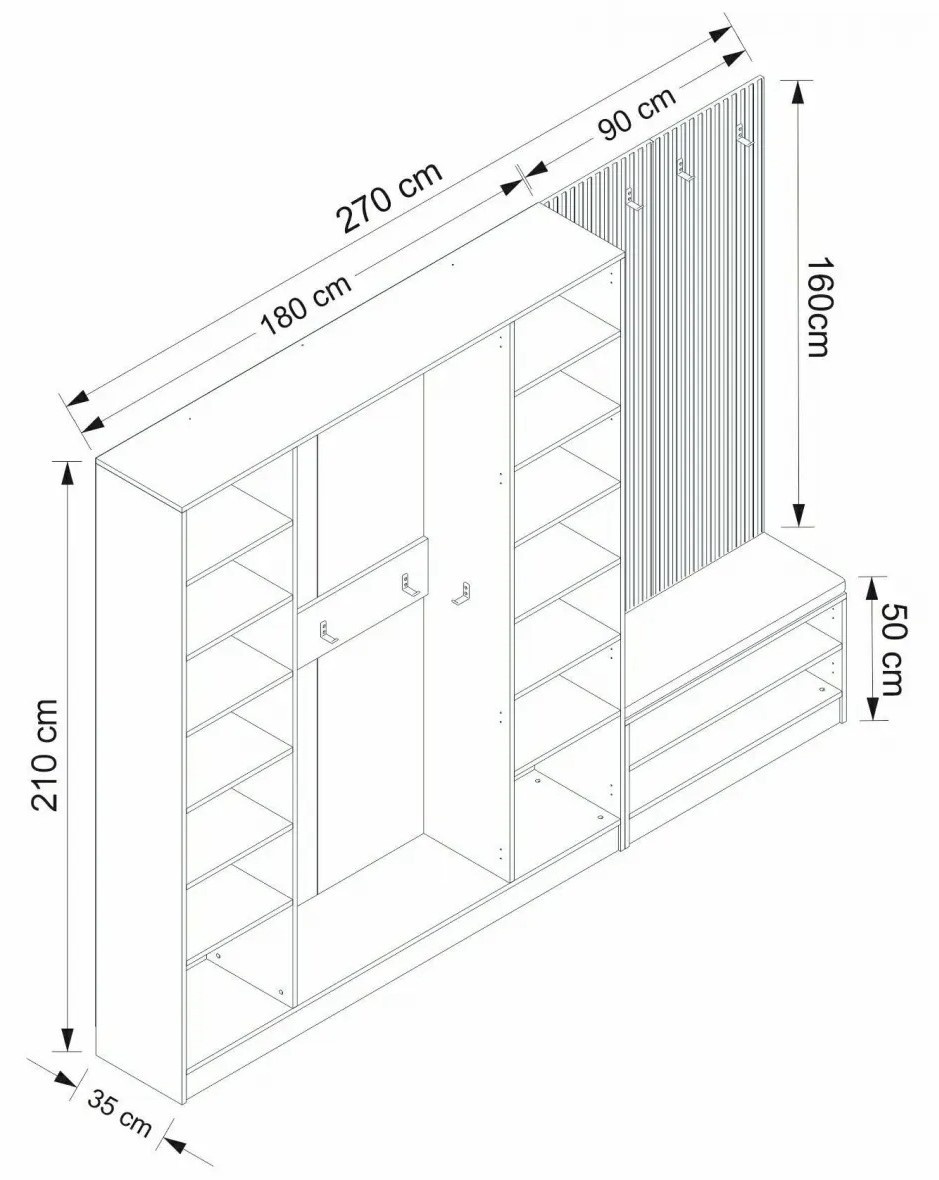 Cu o lățime de 270 cm, o înălțime de 210 cm și o adâncime de 35 cm, suportul pentru hol oferă un spațiu de depozitare generos pentru a menține holul organizat și ordonat. Rafturile și compartimentele spațioase oferă loc pentru chei, corespondență, pălării și alte lucruri esențiale, astfel încât totul să fie la îndemână.