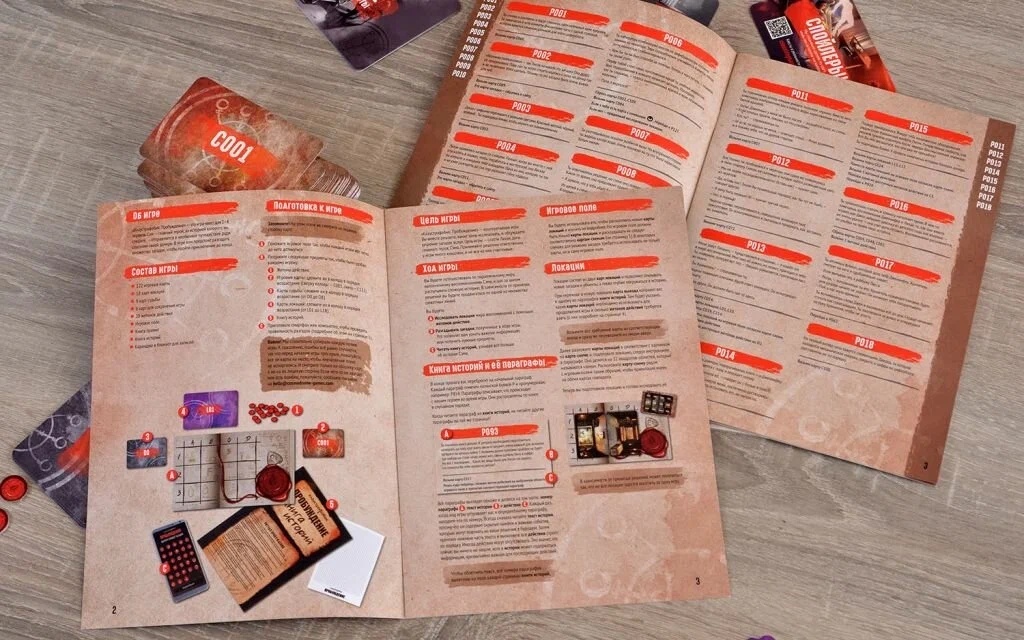 122 de cărți de joc, 9 cărți ale sorții, 18 hărți de locație, carte de povestiri, cartea de reguli, suport de joc, 20 de jetoane de acțiune, 6 cărți pentru a salva jocul, creion și blocnot