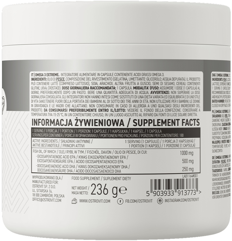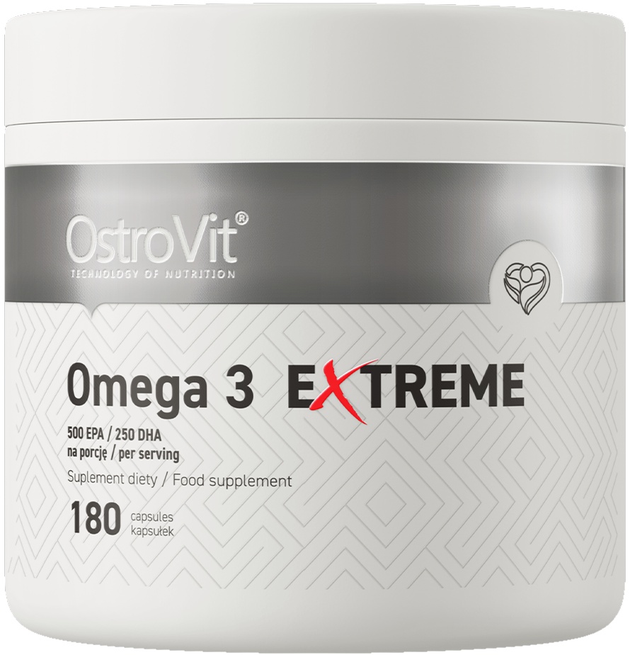 OstroVit Omega-3 Extreme, 180 capsule – supliment alimentar care furnizează organismului până la 1000 mg de ulei de pește per porție. Produsul este o sursă de acizi grași polinesaturați valoroși: acid eicosapentaenoic (EPA) și acid docosahexaenoic (DHA). Disponibil sub formă de capsule moi, ușor de înghițit, o cutie ajunge pentru până la 3 luni de administrare regulată.