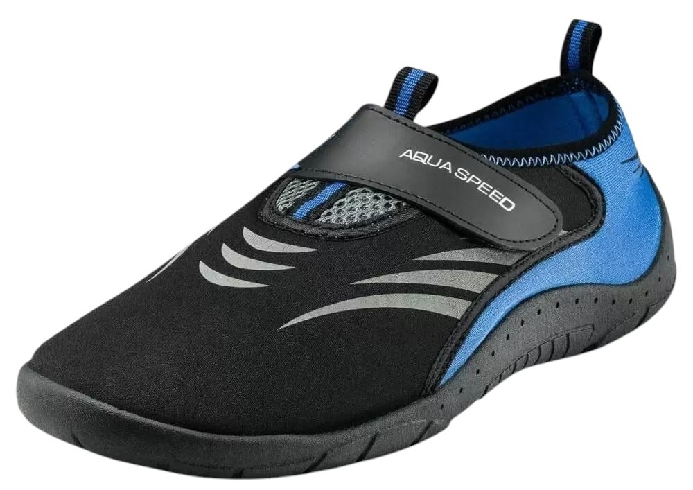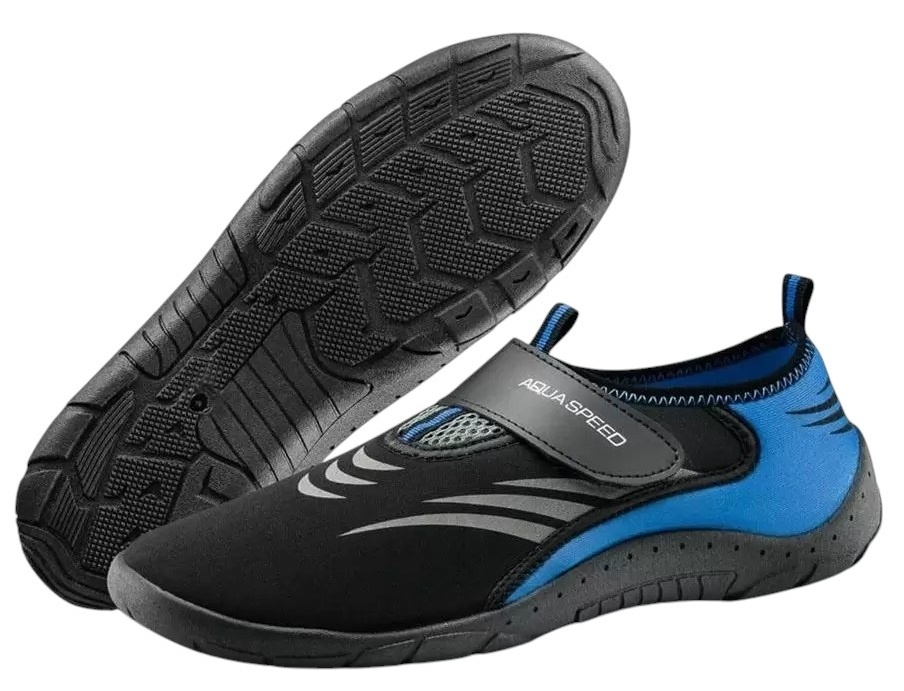 Papuci de apă Aqua Speed 27B, mărimea 46, Black/Blue sunt încălțăminte ușoară și confortabilă pentru mare, plajă, piscină sau plimbări în apropierea apei. Realizați dintr‑un material moale, cu uscare rapidă și rezistent la uzură, care protejează piciorul de pietre ascuțite, corali, pietriș și nisip încins, oferind confort în timpul mersului pe diverse suprafețe. Talpa flexibilă și antiderapantă îmbunătățește aderența pe suprafețe umede sau alunecoase, reducând riscul de alunecare. Culoarea atractivă negru‑albastră face modelul vizibil și stilat, iar prinderea fermă pe picior asigură o poziție confortabilă și sigură. Acești papuci de apă sunt ideali pentru relaxare la plajă, plimbări prin apă, scufundări și activități sportive acvatice.