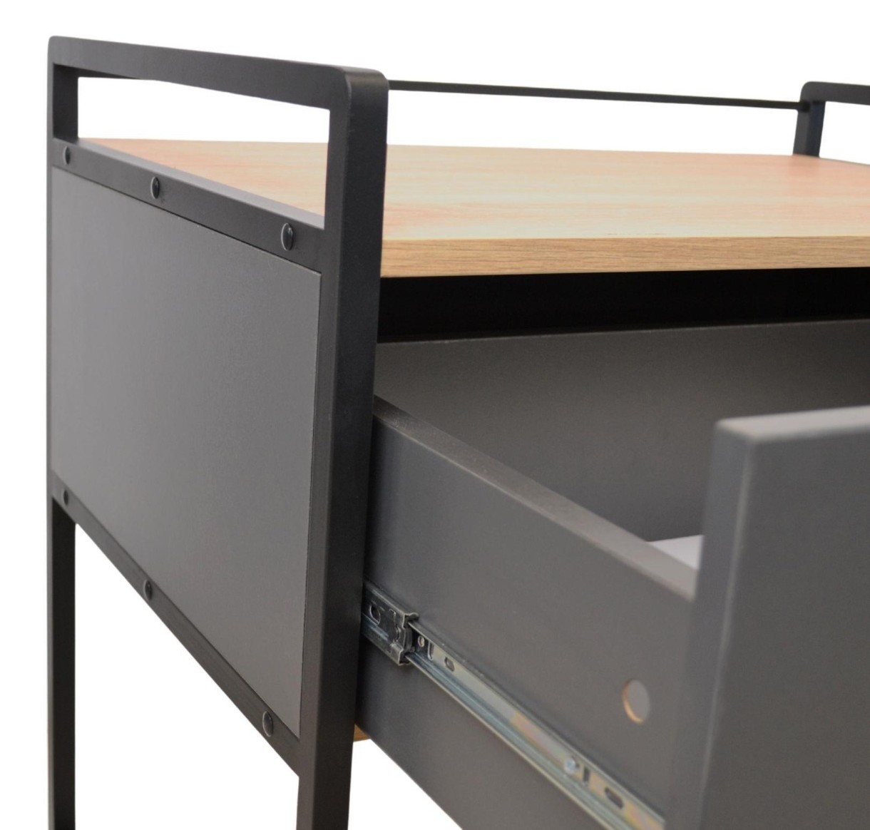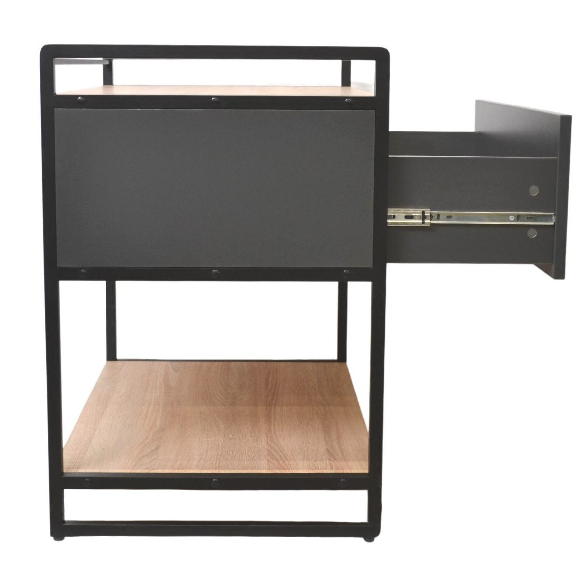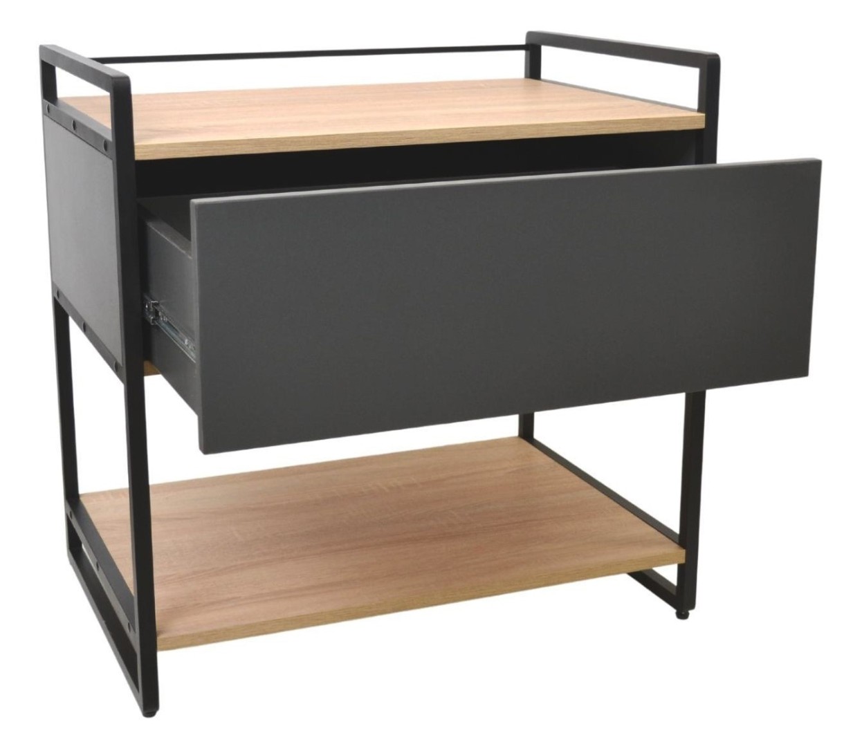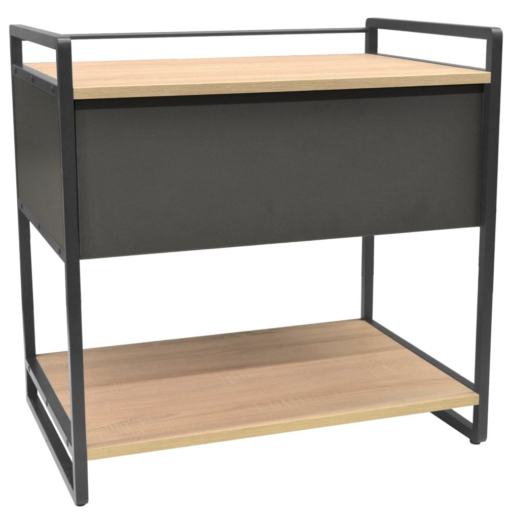 Fabricat pe o structură metalică sudată rezistentă, vopsit în câmp electrostatic și blat din PAL melaminat cantuit cu dimensiuni 74×50×74h cm, raftul dispune de 2 polițe generoase deschise și sertar glisant pentru păstrarea bunurilor și materialelor precum cartușe, cerneală, hârtie și accesorii birotică.