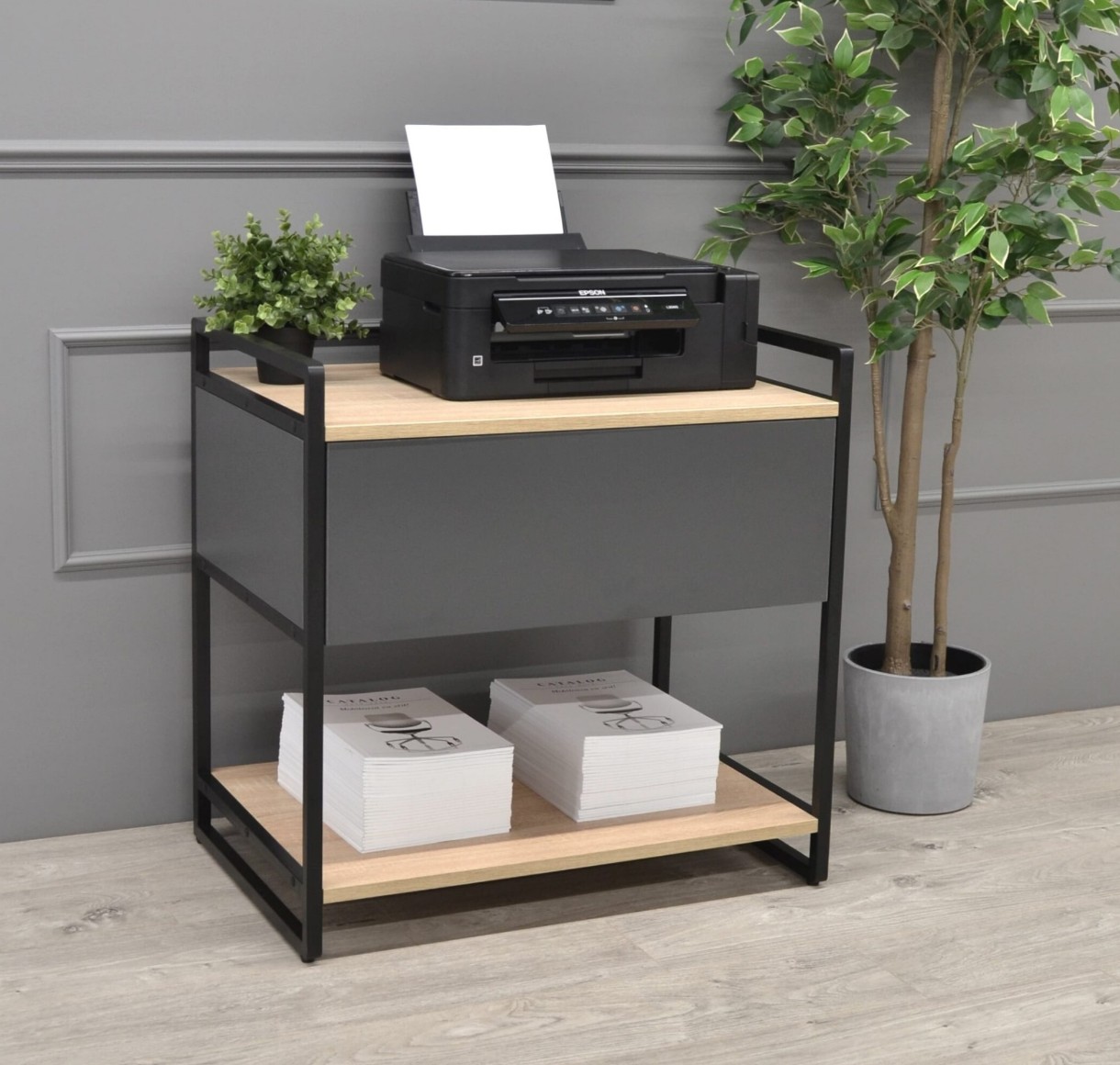 Designul loft-modern și structura ușoară ce poate fi ușor mutată, alcătuiesc o piesă de mobilier perfectă pentru organizarea unității de imprimare și a documentelor necesare din birou — într-un singur loc.