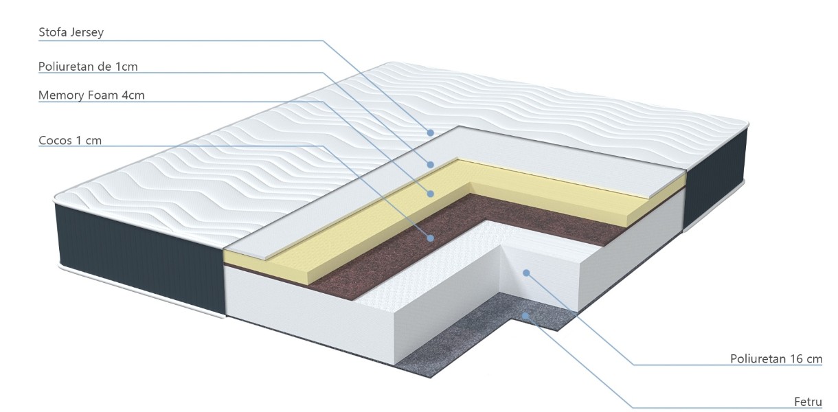 Salteaua Galaxy conține la fel strat de cocos care menține o poziție corectă a coloanei vertebrale în timpul somnului, atât în cazul copiilor, cât și în cazul adulților. Fibră de cocos este un produs 100% natural, care nu își deformează forma pentru o perioadă foarte lungă de timp. O astfel de investiție merită atât din perspectiva unui stil de viață sănătos precum va fi și durabilă în timp, deoarece te vei putea bucura de o saltea cu adevărat fiabilă, iar spuma memory foam duce la eliminarea punctelor de presiune, astfel că vom simți instant o plăcută senzație de confort. Imediat ce ne vom ridica, în câteva secunde doar, salteaua revine la formă inițială.