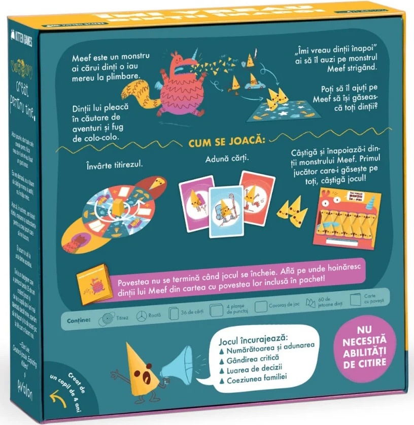 Meef, monstrul, si-a pierdut dintii si are nevoie de ajutorul tau! Strange carti si foloseste ruleta pentru a te apropia de completarea zambetului lui Meef. Primul care aduna toti dintii castiga! Cu exercitii de numaratoare, provocari de strategie distractive si o poveste amuzanta pe care o puteti citi impreuna cu cei mici, acest joc este usor de inteles pentru oricine! Perfect pentru seri de jocuri in familie pline de rasete sau pentru momente de legatura unu-la-unu intre parinte si copil.
