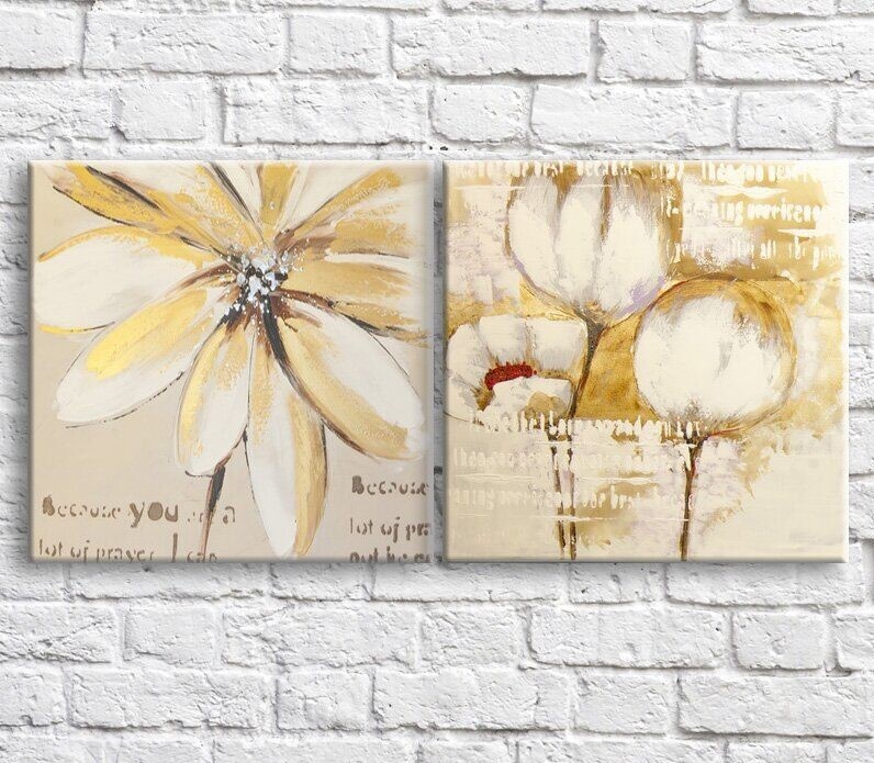 Pictură ArtPoster Cream gerbera and poppies on a Beige background with text, diptych (3467747)
