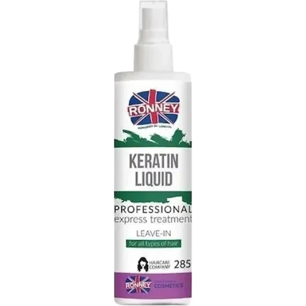 Spray pentru păr Ronney Liquid Keratin 285 ml — produs profesional pentru refacerea, întărirea și protecția părului cu structură deteriorată.