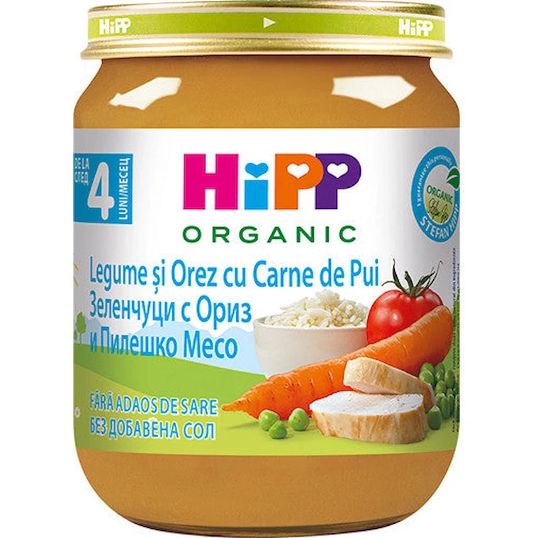 Hipp Organic Vegetables with Rice and Chicken este un piure organic de carne pentru bebelusi cu orez si pui destinat bebelusilor peste 4 luni. Produsul completează hrana pentru bebeluși din lapte și oferă copilului vitamine esențiale, contribuind astfel la formarea mecanismelor naturale de apărare ale organismului.