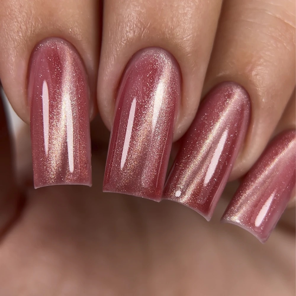 Efect Cat Eye: Particulele metalice speciale reacționează la magnet, creând reflexii, lumini și modele volumetrice.