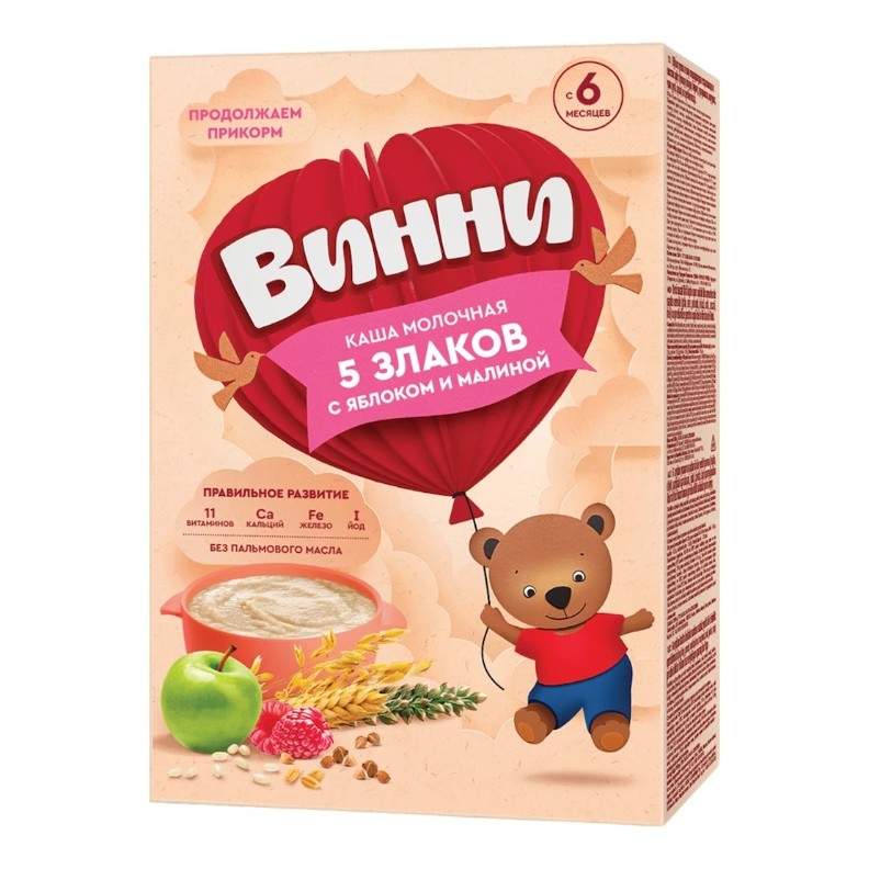 Ingrediente: făină (grâu; orez; ovăz; hrișcă; secară); lapte integral praf; zahăr; fulgi de măr; fulgi de zmeură; minerale (carbonat de calciu; pirofosfat de fier; iodură de potasiu); vitamine (acid L-ascorbic; nicotinamidă; acetat de D-alfa-tocoferol; D-pantotenat de calciu; riboflavină; clorhidrat de piridoxină; mononitrat de tiamină; acetat de retinol; acid folic; D-biotină; cianocobalamină). Conține gluten.