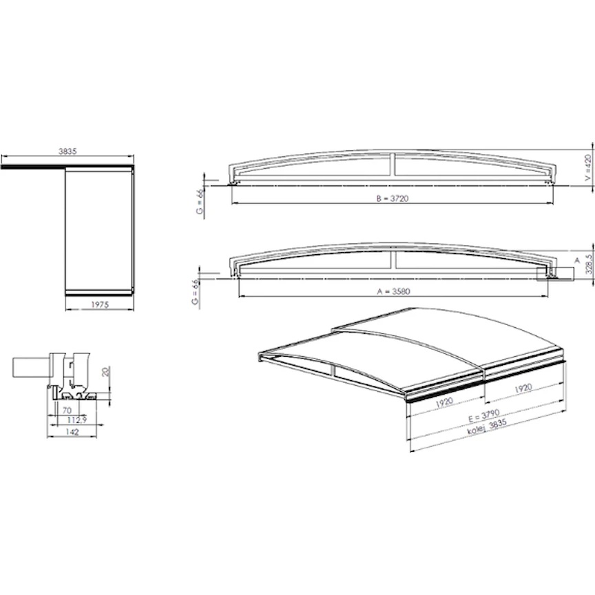 Spre deosebire de alte acoperișuri de pe piață, pavilionul SYDNEY permite instalarea șinei doar pe o parte, oferind mai multă flexibilitate în spații înguste sau lângă pereți. Capetele ușor înălțate pot trece peste margini sau obstacole de până la 5 cm înălțime.