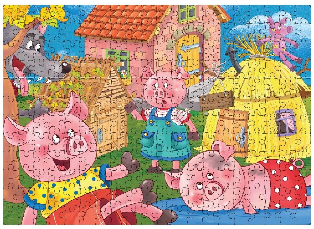 Puzzle cu 240 de piese de imbinat care alcatuiesc o plansa dreptunghiulara de 42 cm x 30 cm pe care este ilustrata o scena din povestea „Cei trei purcelusi“.