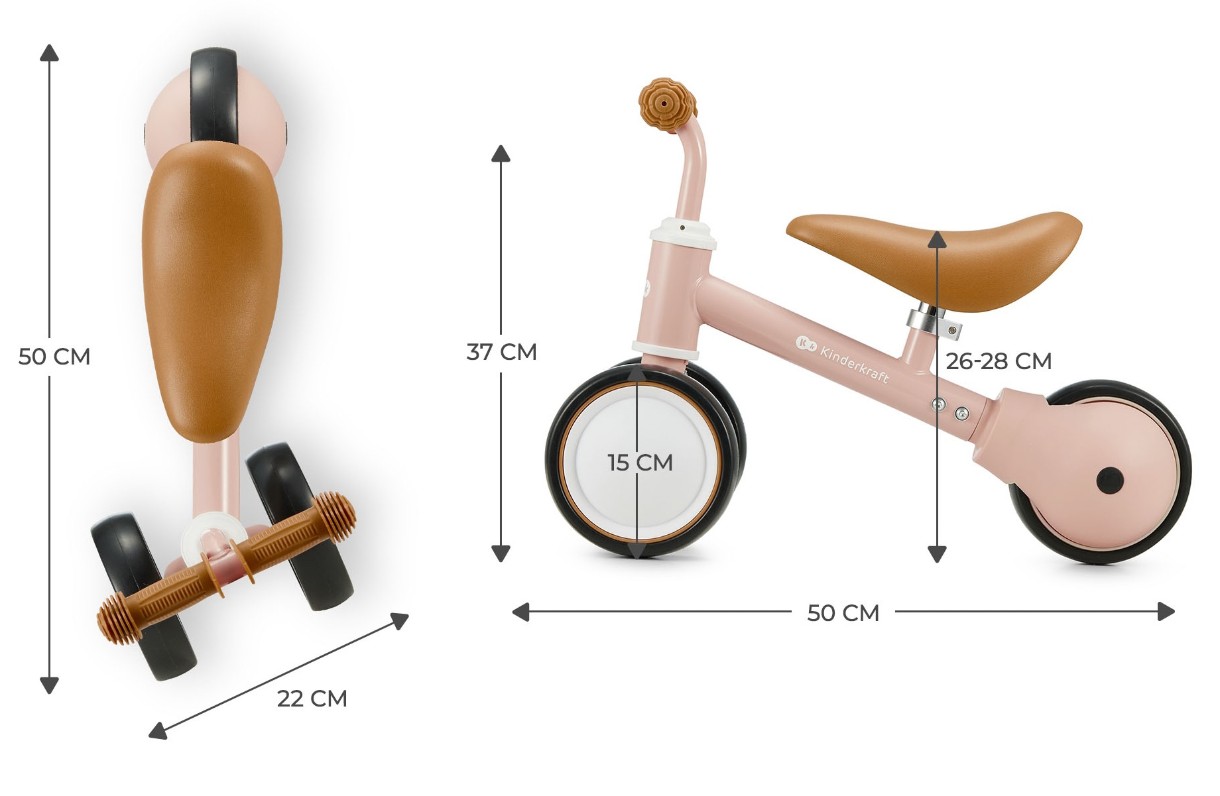 Înălțimea șeii poate fi reglată cu o cheie Allen (interval: 26-28 cm). Roata din spate are rulmenți, ceea ce face ca mersul să fie și mai durabil și oferă o plimbare lină și plăcută. Mânerele de cauciuc sunt potrivite chiar și pentru cei mai mici copii. Materialul lor nu conține substanțe nocive. Acest lucru asigură copilului tău o prindere fermă pe ghidon, asigurând o joacă în siguranță.